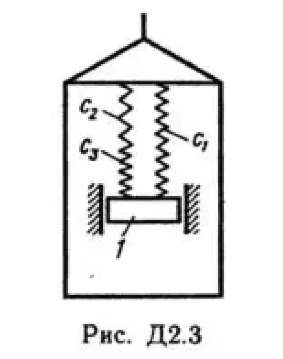 Груз 1 массой m укреплен на пружинной подвеске в лифте (рис. Д2.0 — Д2.9, табл. Д2). Лифт движется вертикально по закону z = 0,5α1t2 + α2sin(ωt) + α3cos(ωt) (ось z направлена по вертикали вверх; z выражено в метрах, t — в секундах). На груз действует сила сопротивления среды R = μv, где v — скорость груза по отношению к лифту. Найти закон движения груза по отношению к лифту, т. е. х = f(t); начало координат поместить в точке, где находится прикрепленный к грузу конец пружины, когда пружина не деформирована. При этом во избежание ошибок в знаках направить ось х в сторону удлинения пружины, а груз изобразить в положении, при котором х>0, т.е. пружина растянута. При подсчетах можно принять g = 10 м/с2. Массой пружин и соединительной планки 2 пренебречь. В таблице обозначено: c1, с2, c3 — коэффициенты жесткости пружин, λ0 — удлинение пружины с эквивалентной жесткостью в начальный момент времени t = 0, v0 — начальная скорость груза по отношению к лифту (направлена вертикально вверх). Прочерк в столбцах c1, с2, c3 означает, что соответствующая пружина отсутствует и на чертеже изображаться не должна. Если при этом конец одной из оставшихся пружин окажется свободным, его следует прикрепить в соответствующем месте или к грузу или к потолку (полу) лифта; то же следует сделать, если свободными окажутся соединенные планкой 2 концы обеих оставшихся пружин. Условие μ = 0 означает, что сила сопротивления R отсутствует.