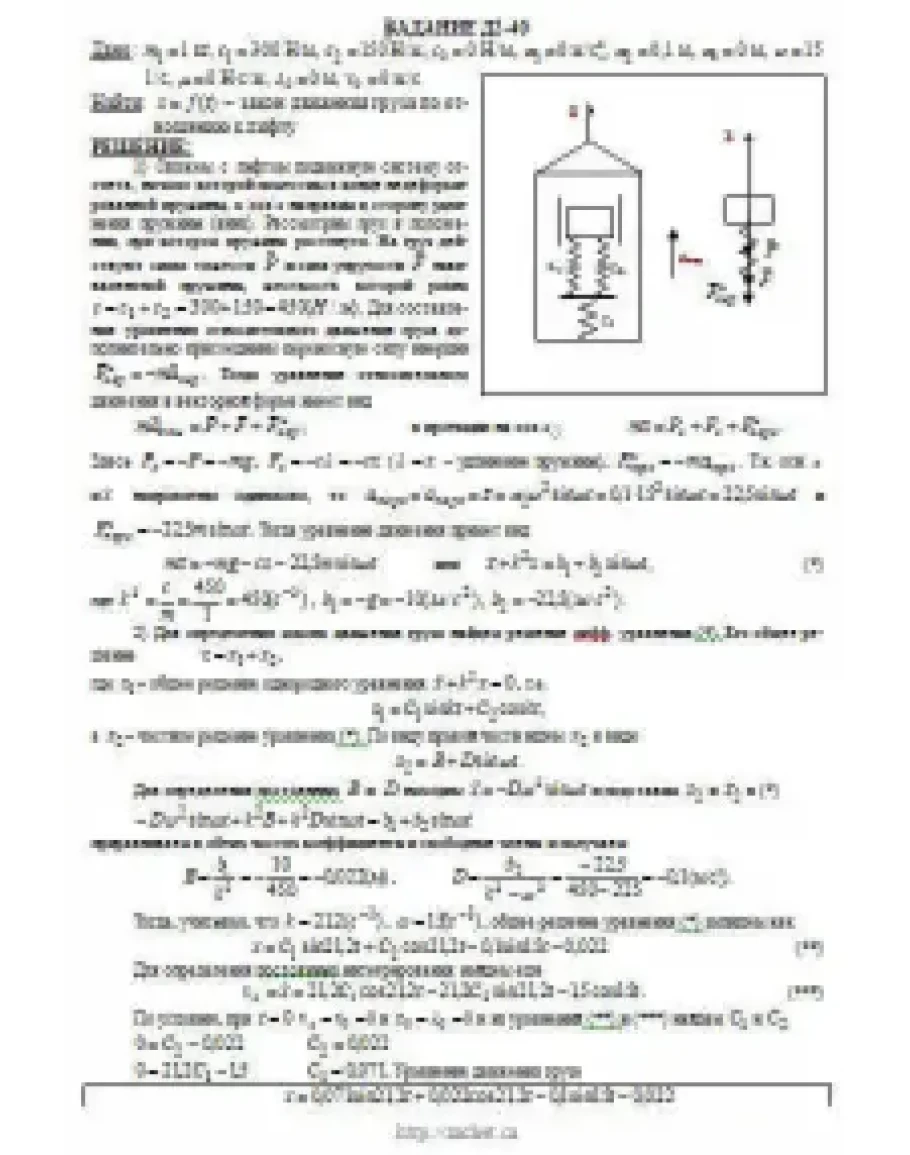 Груз 1 массой m укреплен на пружинной подвеске в лифте (рис. Д2.0 — Д2.9, табл. Д2). Лифт движется вертикально по закону z = 0,5α1t2 + α2sin(ωt) + α3cos(ωt) (ось z направлена по вертикали вверх; z выражено в метрах, t — в секундах). На груз действует сила сопротивления среды R = μv, где v — скорость груза по отношению к лифту. Найти закон движения груза по отношению к лифту, т. е. х = f(t); начало координат поместить в точке, где находится прикрепленный к грузу конец пружины, когда пружина не деформирована. При этом во избежание ошибок в знаках направить ось х в сторону удлинения пружины, а груз изобразить в положении, при котором х>0, т.е. пружина растянута. При подсчетах можно принять g = 10 м/с2. Массой пружин и соединительной планки 2 пренебречь. В таблице обозначено: c1, с2, c3 — коэффициенты жесткости пружин, λ0 — удлинение пружины с эквивалентной жесткостью в начальный момент времени t = 0, v0 — начальная скорость груза по отношению к лифту (направлена вертикально вверх). Прочерк в столбцах c1, с2, c3 означает, что соответствующая пружина отсутствует и на чертеже изображаться не должна. Если при этом конец одной из оставшихся пружин окажется свободным, его следует прикрепить в соответствующем месте или к грузу или к потолку (полу) лифта; то же следует сделать, если свободными окажутся соединенные планкой 2 концы обеих оставшихся пружин. Условие μ = 0 означает, что сила сопротивления R отсутствует.