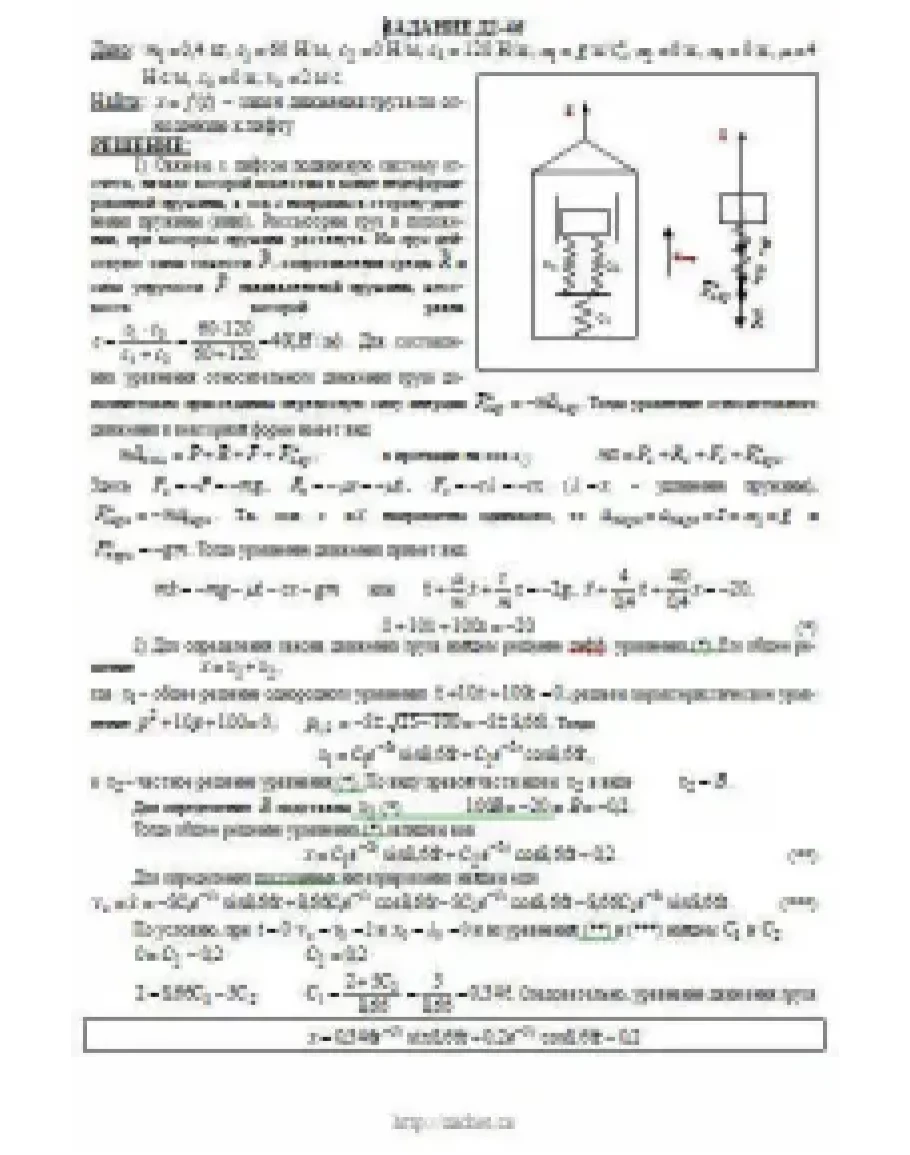 Груз 1 массой m укреплен на пружинной подвеске в лифте (рис. Д2.0 — Д2.9, табл. Д2). Лифт движется вертикально по закону z = 0,5α1t2 + α2sin(ωt) + α3cos(ωt) (ось z направлена по вертикали вверх; z выражено в метрах, t — в секундах). На груз действует сила сопротивления среды R = μv, где v — скорость груза по отношению к лифту. Найти закон движения груза по отношению к лифту, т. е. х = f(t); начало координат поместить в точке, где находится прикрепленный к грузу конец пружины, когда пружина не деформирована. При этом во избежание ошибок в знаках направить ось х в сторону удлинения пружины, а груз изобразить в положении, при котором х>0, т.е. пружина растянута. При подсчетах можно принять g = 10 м/с2. Массой пружин и соединительной планки 2 пренебречь. В таблице обозначено: c1, с2, c3 — коэффициенты жесткости пружин, λ0 — удлинение пружины с эквивалентной жесткостью в начальный момент времени t = 0, v0 — начальная скорость груза по отношению к лифту (направлена вертикально вверх). Прочерк в столбцах c1, с2, c3 означает, что соответствующая пружина отсутствует и на чертеже изображаться не должна. Если при этом конец одной из оставшихся пружин окажется свободным, его следует прикрепить в соответствующем месте или к грузу или к потолку (полу) лифта; то же следует сделать, если свободными окажутся соединенные планкой 2 концы обеих оставшихся пружин. Условие μ = 0 означает, что сила сопротивления R отсутствует.