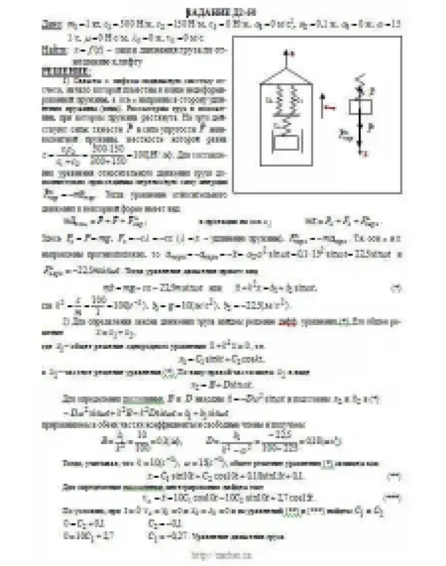 Груз 1 массой m укреплен на пружинной подвеске в лифте (рис. Д2.0 — Д2.9, табл. Д2). Лифт движется вертикально по закону z = 0,5α1t2 + α2sin(ωt) + α3cos(ωt) (ось z направлена по вертикали вверх; z выражено в метрах, t — в секундах). На груз действует сила сопротивления среды R = μv, где v — скорость груза по отношению к лифту. Найти закон движения груза по отношению к лифту, т. е. х = f(t); начало координат поместить в точке, где находится прикрепленный к грузу конец пружины, когда пружина не деформирована. При этом во избежание ошибок в знаках направить ось х в сторону удлинения пружины, а груз изобразить в положении, при котором х>0, т.е. пружина растянута. При подсчетах можно принять g = 10 м/с2. Массой пружин и соединительной планки 2 пренебречь. В таблице обозначено: c1, с2, c3 — коэффициенты жесткости пружин, λ0 — удлинение пружины с эквивалентной жесткостью в начальный момент времени t = 0, v0 — начальная скорость груза по отношению к лифту (направлена вертикально вверх). Прочерк в столбцах c1, с2, c3 означает, что соответствующая пружина отсутствует и на чертеже изображаться не должна. Если при этом конец одной из оставшихся пружин окажется свободным, его следует прикрепить в соответствующем месте или к грузу или к потолку (полу) лифта; то же следует сделать, если свободными окажутся соединенные планкой 2 концы обеих оставшихся пружин. Условие μ = 0 означает, что сила сопротивления R отсутствует.