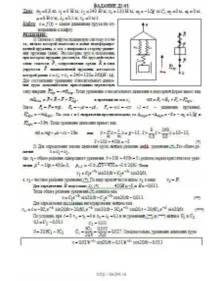 Груз 1 массой m укреплен на пружинной подвеске в лифте (рис. Д2.0 — Д2.9, табл. Д2). Лифт движется вертикально по закону z = 0,5α1t2 + α2sin(ωt) + α3cos(ωt) (ось z направлена по вертикали вверх; z выражено в метрах, t — в секундах). На груз действует сила сопротивления среды R = μv, где v — скорость груза по отношению к лифту. Найти закон движения груза по отношению к лифту, т. е. х = f(t); начало координат поместить в точке, где находится прикрепленный к грузу конец пружины, когда пружина не деформирована. При этом во избежание ошибок в знаках направить ось х в сторону удлинения пружины, а груз изобразить в положении, при котором х>0, т.е. пружина растянута. При подсчетах можно принять g = 10 м/с2. Массой пружин и соединительной планки 2 пренебречь. В таблице обозначено: c1, с2, c3 — коэффициенты жесткости пружин, λ0 — удлинение пружины с эквивалентной жесткостью в начальный момент времени t = 0, v0 — начальная скорость груза по отношению к лифту (направлена вертикально вверх). Прочерк в столбцах c1, с2, c3 означает, что соответствующая пружина отсутствует и на чертеже изображаться не должна. Если при этом конец одной из оставшихся пружин окажется свободным, его следует прикрепить в соответствующем месте или к грузу или к потолку (полу) лифта; то же следует сделать, если свободными окажутся соединенные планкой 2 концы обеих оставшихся пружин. Условие μ = 0 означает, что сила сопротивления R отсутствует.