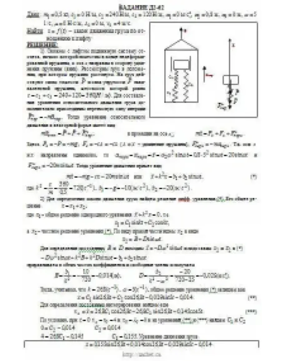 Груз 1 массой m укреплен на пружинной подвеске в лифте (рис. Д2.0 — Д2.9, табл. Д2). Лифт движется вертикально по закону z = 0,5α1t2 + α2sin(ωt) + α3cos(ωt) (ось z направлена по вертикали вверх; z выражено в метрах, t — в секундах). На груз действует сила сопротивления среды R = μv, где v — скорость груза по отношению к лифту. Найти закон движения груза по отношению к лифту, т. е. х = f(t); начало координат поместить в точке, где находится прикрепленный к грузу конец пружины, когда пружина не деформирована. При этом во избежание ошибок в знаках направить ось х в сторону удлинения пружины, а груз изобразить в положении, при котором х>0, т.е. пружина растянута. При подсчетах можно принять g = 10 м/с2. Массой пружин и соединительной планки 2 пренебречь. В таблице обозначено: c1, с2, c3 — коэффициенты жесткости пружин, λ0 — удлинение пружины с эквивалентной жесткостью в начальный момент времени t = 0, v0 — начальная скорость груза по отношению к лифту (направлена вертикально вверх). Прочерк в столбцах c1, с2, c3 означает, что соответствующая пружина отсутствует и на чертеже изображаться не должна. Если при этом конец одной из оставшихся пружин окажется свободным, его следует прикрепить в соответствующем месте или к грузу или к потолку (полу) лифта; то же следует сделать, если свободными окажутся соединенные планкой 2 концы обеих оставшихся пружин. Условие μ = 0 означает, что сила сопротивления R отсутствует.