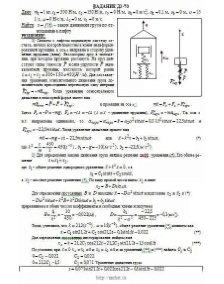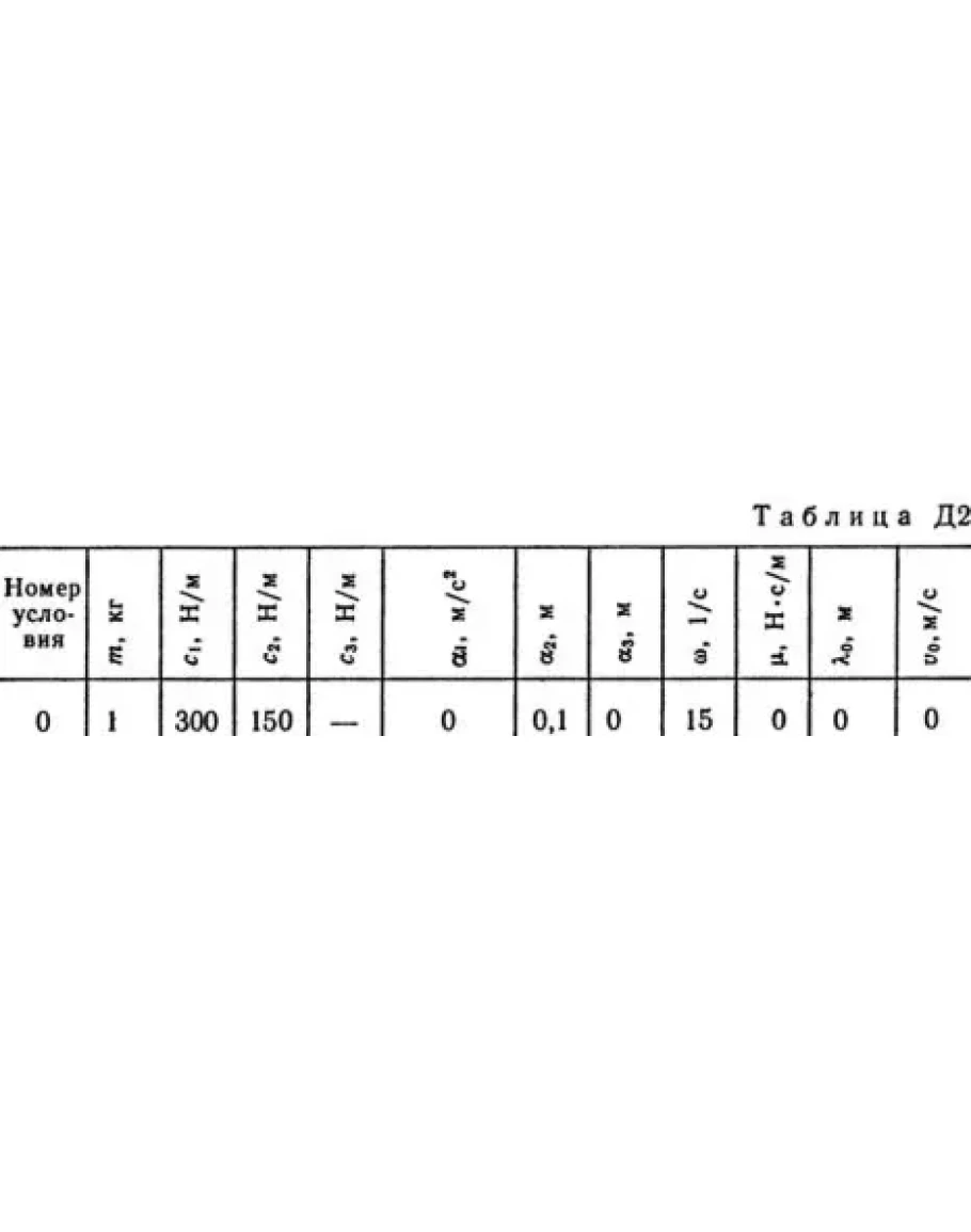 Груз 1 массой m укреплен на пружинной подвеске в лифте (рис. Д2.0 — Д2.9, табл. Д2). Лифт движется вертикально по закону z = 0,5α1t2 + α2sin(ωt) + α3cos(ωt) (ось z направлена по вертикали вверх; z выражено в метрах, t — в секундах). На груз действует сила сопротивления среды R = μv, где v — скорость груза по отношению к лифту. Найти закон движения груза по отношению к лифту, т. е. х = f(t); начало координат поместить в точке, где находится прикрепленный к грузу конец пружины, когда пружина не деформирована. При этом во избежание ошибок в знаках направить ось х в сторону удлинения пружины, а груз изобразить в положении, при котором х>0, т.е. пружина растянута. При подсчетах можно принять g = 10 м/с2. Массой пружин и соединительной планки 2 пренебречь. В таблице обозначено: c1, с2, c3 — коэффициенты жесткости пружин, λ0 — удлинение пружины с эквивалентной жесткостью в начальный момент времени t = 0, v0 — начальная скорость груза по отношению к лифту (направлена вертикально вверх). Прочерк в столбцах c1, с2, c3 означает, что соответствующая пружина отсутствует и на чертеже изображаться не должна. Если при этом конец одной из оставшихся пружин окажется свободным, его следует прикрепить в соответствующем месте или к грузу или к потолку (полу) лифта; то же следует сделать, если свободными окажутся соединенные планкой 2 концы обеих оставшихся пружин. Условие μ = 0 означает, что сила сопротивления R отсутствует.