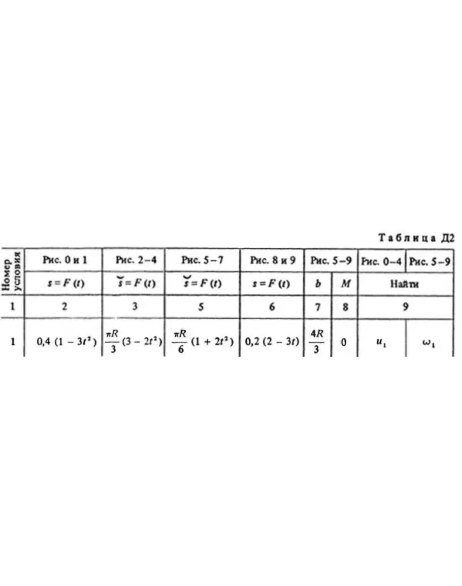 Механическая система состоит из прямоугольной вертикальной плиты 1 массой m1 = 24 кг и груза D массой m2 = 8 кг; плита или движется вокруг горизонтальных направляющий (рис. Д2.0-Д2.4), или вращается вокруг вертикальной оси z, лежащей в плоскости плиты (рис. Д2.5-Д2.9). В момент времени t0 = 0 груз начинает двигаться под действием внутренних сил по имеющемуся на плите желобу; закон его движения s = AD = F(t) задан в табл. Д2, где s выражено в метрах, t – в секундах. Форма желоба на рис. Д2.0, Д2.1, Д2.8, Д2.9 – прямолинейная (желоб КЕ), на рис. Д2.2-Д2.7 – окружность радиуса R = 0,8 м с центром в центре масс C1 плиты (s = AD на рис. Д2.2 - Д2.7 отсчитывается по дуге окружности). Плита (рис. Д2.0-Д2.4) имеет в момент t0 = 0 скорость v0 = 0. Плита (рис Д2.5-Д2.9) имеет в момент времени t0 = 0 угловую скорость ω0 = 8 с-1, и в этот момент на нее начинает действовать вращательный момент М (момент относительно оси), заданный в таблице в ньютонометрах и направленный как ω0 при М > 0 и в противоположную сторону при М < 0. Ось z проходит от центра C1 плиты на расстоянии b; размеры плиты показаны на рисунках. Считая грузы материальной точкой и пренебрегая всеми сопротивлениями, определить указанное в таблице в столбцах 4 и 9, где обозначено: в столбце 4 (относится к рис. Д2.0-Д2.4) x1 – перемещение плиты за время от t0 = 0 до t1 = 1 с, v – скорость плиты в момент времени t1 = 1 с, N – полная сила нормального давления плиты на направляющие в момент времени t = 1 с (указать, куда сила направлена); в столбце 9 (относится к рис. 5-9) ω1 – угловая скорость плиты в момент времени t1 = 1 с, ω = f(t) – угловая скорость плиты как функция времени. На всех рисунках груз показан в положении, при котором s = AD > 0; при x < 0 груз находится по другую сторону от точки А.