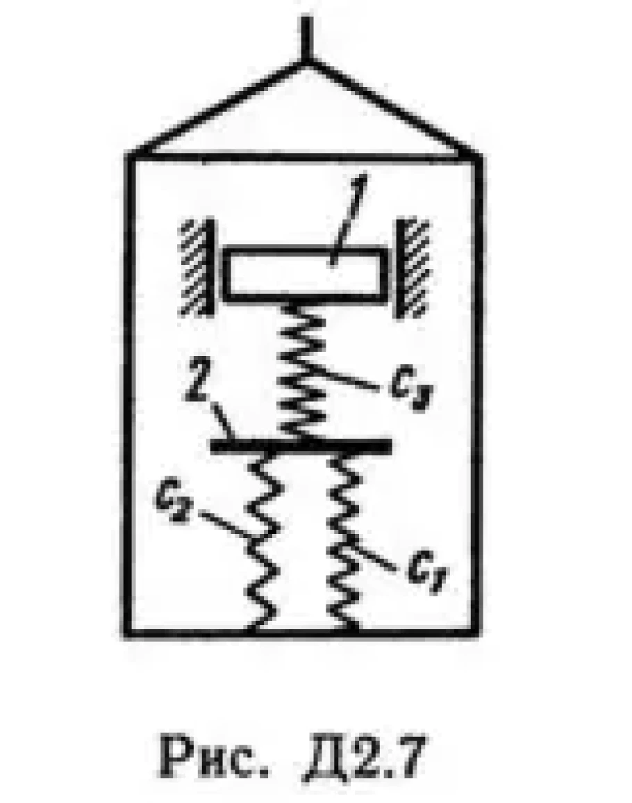 Груз 1 массой m укреплен на пружинной подвеске в лифте (рис. Д2.0 — Д2.9, табл. Д2). Лифт движется вертикально по закону z = 0,5α1t2 + α2sin(ωt) + α3cos(ωt) (ось z направлена по вертикали вверх; z выражено в метрах, t — в секундах). На груз действует сила сопротивления среды R = μv, где v — скорость груза по отношению к лифту. Найти закон движения груза по отношению к лифту, т. е. х = f(t); начало координат поместить в точке, где находится прикрепленный к грузу конец пружины, когда пружина не деформирована. При этом во избежание ошибок в знаках направить ось х в сторону удлинения пружины, а груз изобразить в положении, при котором х>0, т.е. пружина растянута. При подсчетах можно принять g = 10 м/с2. Массой пружин и соединительной планки 2 пренебречь. В таблице обозначено: c1, с2, c3 — коэффициенты жесткости пружин, λ0 — удлинение пружины с эквивалентной жесткостью в начальный момент времени t = 0, v0 — начальная скорость груза по отношению к лифту (направлена вертикально вверх). Прочерк в столбцах c1, с2, c3 означает, что соответствующая пружина отсутствует и на чертеже изображаться не должна. Если при этом конец одной из оставшихся пружин окажется свободным, его следует прикрепить в соответствующем месте или к грузу или к потолку (полу) лифта; то же следует сделать, если свободными окажутся соединенные планкой 2 концы обеих оставшихся пружин. Условие μ = 0 означает, что сила сопротивления R отсутствует.