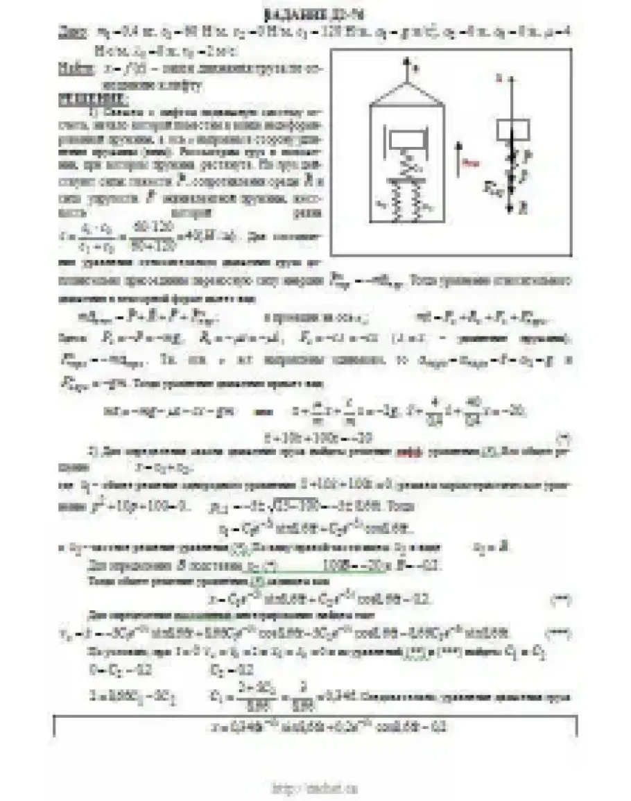 Груз 1 массой m укреплен на пружинной подвеске в лифте (рис. Д2.0 — Д2.9, табл. Д2). Лифт движется вертикально по закону z = 0,5α1t2 + α2sin(ωt) + α3cos(ωt) (ось z направлена по вертикали вверх; z выражено в метрах, t — в секундах). На груз действует сила сопротивления среды R = μv, где v — скорость груза по отношению к лифту. Найти закон движения груза по отношению к лифту, т. е. х = f(t); начало координат поместить в точке, где находится прикрепленный к грузу конец пружины, когда пружина не деформирована. При этом во избежание ошибок в знаках направить ось х в сторону удлинения пружины, а груз изобразить в положении, при котором х>0, т.е. пружина растянута. При подсчетах можно принять g = 10 м/с2. Массой пружин и соединительной планки 2 пренебречь. В таблице обозначено: c1, с2, c3 — коэффициенты жесткости пружин, λ0 — удлинение пружины с эквивалентной жесткостью в начальный момент времени t = 0, v0 — начальная скорость груза по отношению к лифту (направлена вертикально вверх). Прочерк в столбцах c1, с2, c3 означает, что соответствующая пружина отсутствует и на чертеже изображаться не должна. Если при этом конец одной из оставшихся пружин окажется свободным, его следует прикрепить в соответствующем месте или к грузу или к потолку (полу) лифта; то же следует сделать, если свободными окажутся соединенные планкой 2 концы обеих оставшихся пружин. Условие μ = 0 означает, что сила сопротивления R отсутствует.