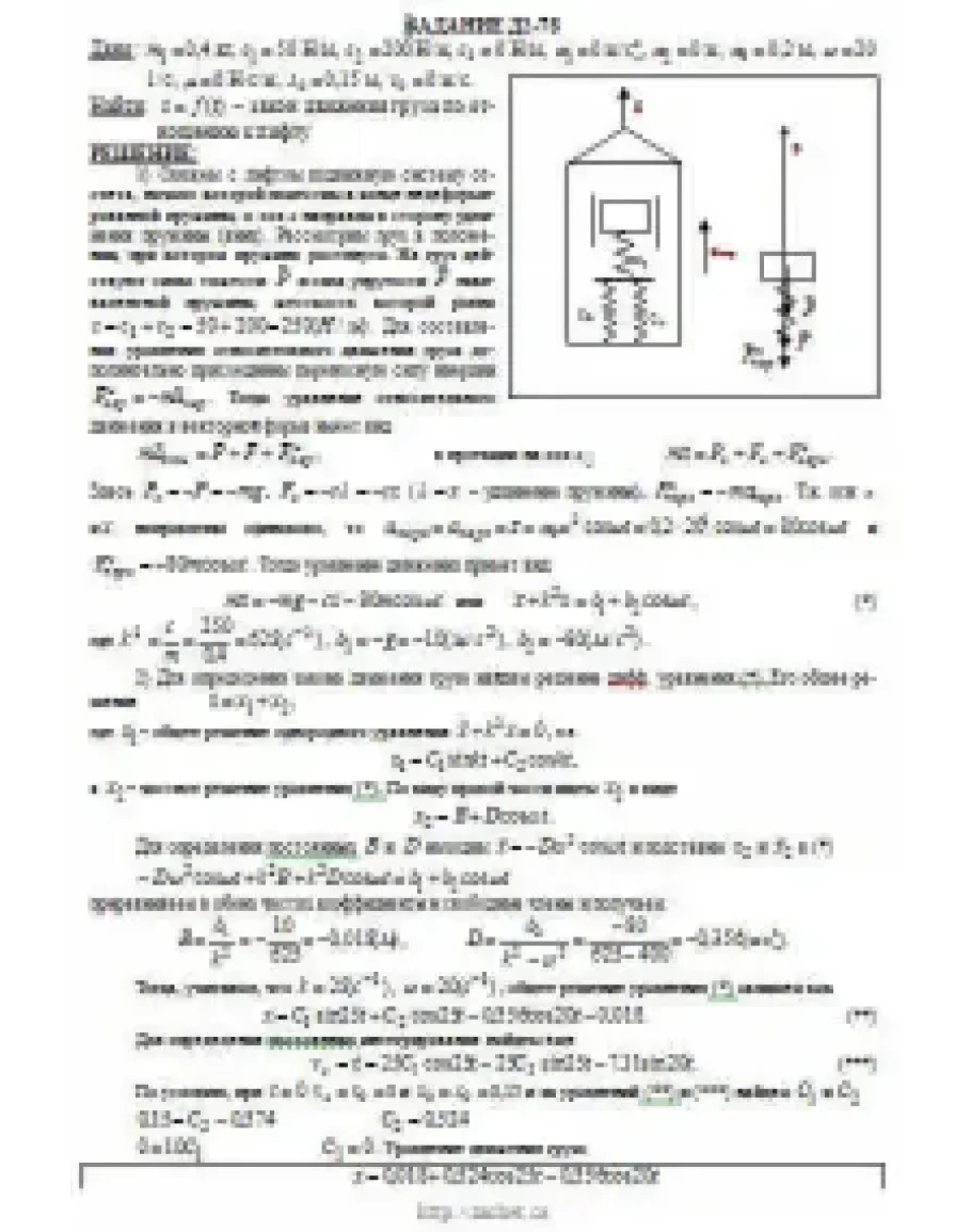 Груз 1 массой m укреплен на пружинной подвеске в лифте (рис. Д2.0 — Д2.9, табл. Д2). Лифт движется вертикально по закону z = 0,5α1t2 + α2sin(ωt) + α3cos(ωt) (ось z направлена по вертикали вверх; z выражено в метрах, t — в секундах). На груз действует сила сопротивления среды R = μv, где v — скорость груза по отношению к лифту. Найти закон движения груза по отношению к лифту, т. е. х = f(t); начало координат поместить в точке, где находится прикрепленный к грузу конец пружины, когда пружина не деформирована. При этом во избежание ошибок в знаках направить ось х в сторону удлинения пружины, а груз изобразить в положении, при котором х>0, т.е. пружина растянута. При подсчетах можно принять g = 10 м/с2. Массой пружин и соединительной планки 2 пренебречь. В таблице обозначено: c1, с2, c3 — коэффициенты жесткости пружин, λ0 — удлинение пружины с эквивалентной жесткостью в начальный момент времени t = 0, v0 — начальная скорость груза по отношению к лифту (направлена вертикально вверх). Прочерк в столбцах c1, с2, c3 означает, что соответствующая пружина отсутствует и на чертеже изображаться не должна. Если при этом конец одной из оставшихся пружин окажется свободным, его следует прикрепить в соответствующем месте или к грузу или к потолку (полу) лифта; то же следует сделать, если свободными окажутся соединенные планкой 2 концы обеих оставшихся пружин. Условие μ = 0 означает, что сила сопротивления R отсутствует.