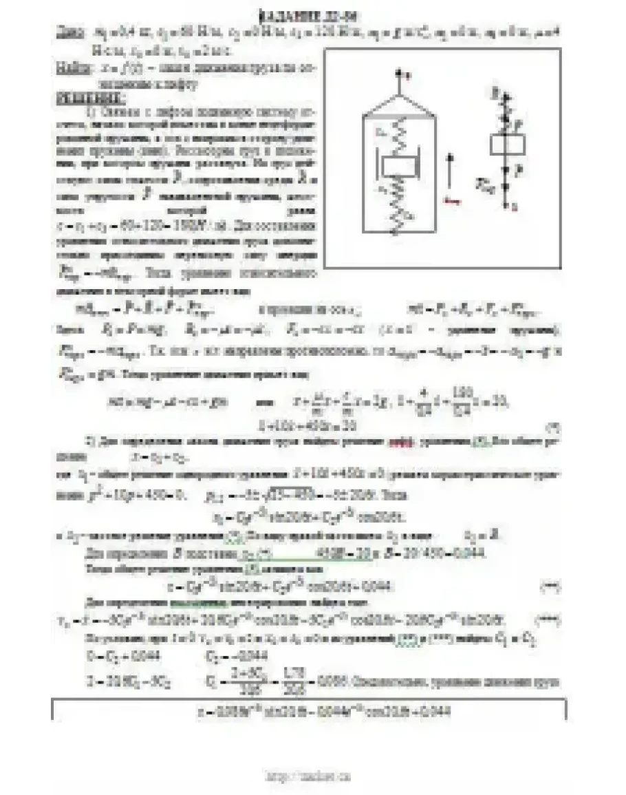 Груз 1 массой m укреплен на пружинной подвеске в лифте (рис. Д2.0 — Д2.9, табл. Д2). Лифт движется вертикально по закону z = 0,5α1t2 + α2sin(ωt) + α3cos(ωt) (ось z направлена по вертикали вверх; z выражено в метрах, t — в секундах). На груз действует сила сопротивления среды R = μv, где v — скорость груза по отношению к лифту. Найти закон движения груза по отношению к лифту, т. е. х = f(t); начало координат поместить в точке, где находится прикрепленный к грузу конец пружины, когда пружина не деформирована. При этом во избежание ошибок в знаках направить ось х в сторону удлинения пружины, а груз изобразить в положении, при котором х>0, т.е. пружина растянута. При подсчетах можно принять g = 10 м/с2. Массой пружин и соединительной планки 2 пренебречь. В таблице обозначено: c1, с2, c3 — коэффициенты жесткости пружин, λ0 — удлинение пружины с эквивалентной жесткостью в начальный момент времени t = 0, v0 — начальная скорость груза по отношению к лифту (направлена вертикально вверх). Прочерк в столбцах c1, с2, c3 означает, что соответствующая пружина отсутствует и на чертеже изображаться не должна. Если при этом конец одной из оставшихся пружин окажется свободным, его следует прикрепить в соответствующем месте или к грузу или к потолку (полу) лифта; то же следует сделать, если свободными окажутся соединенные планкой 2 концы обеих оставшихся пружин. Условие μ = 0 означает, что сила сопротивления R отсутствует.