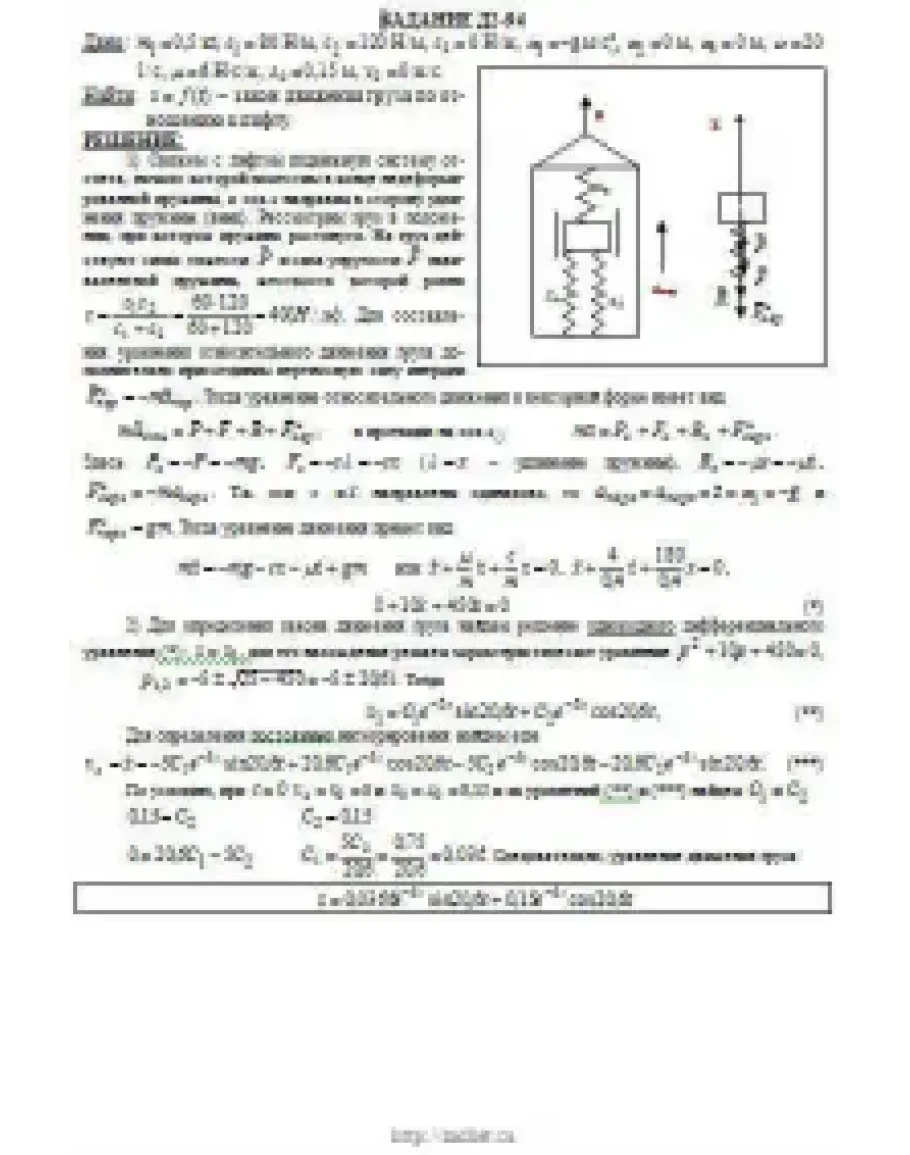 Груз 1 массой m укреплен на пружинной подвеске в лифте (рис. Д2.0 — Д2.9, табл. Д2). Лифт движется вертикально по закону z = 0,5α1t2 + α2sin(ωt) + α3cos(ωt) (ось z направлена по вертикали вверх; z выражено в метрах, t — в секундах). На груз действует сила сопротивления среды R = μv, где v — скорость груза по отношению к лифту. Найти закон движения груза по отношению к лифту, т. е. х = f(t); начало координат поместить в точке, где находится прикрепленный к грузу конец пружины, когда пружина не деформирована. При этом во избежание ошибок в знаках направить ось х в сторону удлинения пружины, а груз изобразить в положении, при котором х>0, т.е. пружина растянута. При подсчетах можно принять g = 10 м/с2. Массой пружин и соединительной планки 2 пренебречь. В таблице обозначено: c1, с2, c3 — коэффициенты жесткости пружин, λ0 — удлинение пружины с эквивалентной жесткостью в начальный момент времени t = 0, v0 — начальная скорость груза по отношению к лифту (направлена вертикально вверх). Прочерк в столбцах c1, с2, c3 означает, что соответствующая пружина отсутствует и на чертеже изображаться не должна. Если при этом конец одной из оставшихся пружин окажется свободным, его следует прикрепить в соответствующем месте или к грузу или к потолку (полу) лифта; то же следует сделать, если свободными окажутся соединенные планкой 2 концы обеих оставшихся пружин. Условие μ = 0 означает, что сила сопротивления R отсутствует.