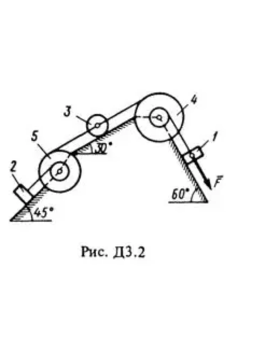 Механическая система состоит из грузов 1 и 2 (коэффициент трения грузов о плоскость F = 0,1), цилиндрического сплошного однородного катка 3 и ступенчатых шкивов 4 и 5 с радиусами ступеней R4 = 0,3 м, r4 = 0,1 м, R5 = 0,2 м, r5 = 0,1 м (массу каждого шкива считать равномерно распределенной по его внешнему ободу) (рис. Д3.0-Д3.9, табл. Д3). Тела системы соединены друг с другом нитями, намотанными на шкивы; участки нитей параллельны соответствующим плоскостям. Под действием силы F = f(x), зависящей от перемещения точки приложения силы, система приходит в движение из состояния покоя. При движении системы на шкивы 4 и 5 действуют постоянные моменты сил сопротивлений, равные соответственно M4 и M5. Определить значение искомой величины в тот момент времени, когда перемещение точки приложения силы F равно s1.