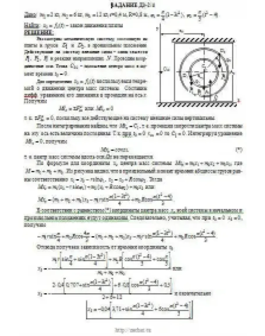 При движении грузов угол φ1 = ∠A2C3D1изменяется по закону φ1 = f1(t), а угол φ2 = ∠A2C3D2 — по закону φ2 = f2(t). В табл. ДЗ эти зависимости даны отдельно для рис. 0—4 и 5—9, где φ выражено в радианах, t — в секундах. Считая грузы материальными точками и пренебрегая всеми сопротивлениями, определить закон изменения со временем величины, указанной в таблице в столбце «Найти», т. е. x3 = t3(t) и N = f(t), где x3 — координата центра C3 плиты (зависимость x3 = f3(t) определяет закон движения плиты), N — полная нормальная реакция направляющих.
