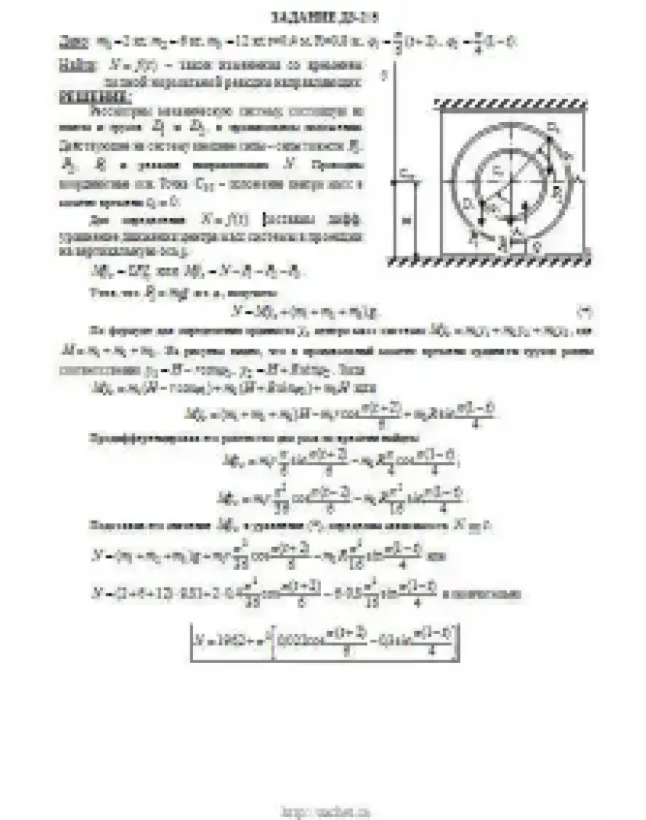 При движении грузов угол φ1 = ∠A2C3D1изменяется по закону φ1 = f1(t), а угол φ2 = ∠A2C3D2 — по закону φ2 = f2(t). В табл. ДЗ эти зависимости даны отдельно для рис. 0—4 и 5—9, где φ выражено в радианах, t — в секундах. Считая грузы материальными точками и пренебрегая всеми сопротивлениями, определить закон изменения со временем величины, указанной в таблице в столбце «Найти», т. е. x3 = t3(t) и N = f(t), где x3 — координата центра C3 плиты (зависимость x3 = f3(t) определяет закон движения плиты), N — полная нормальная реакция направляющих.