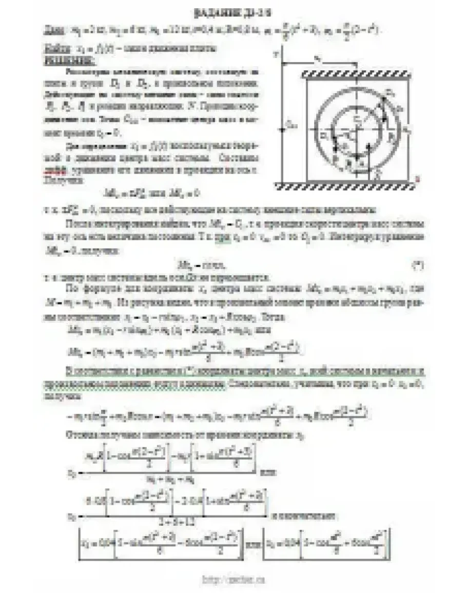 При движении грузов угол φ1 = ∠A2C3D1изменяется по закону φ1 = f1(t), а угол φ2 = ∠A2C3D2 — по закону φ2 = f2(t). В табл. ДЗ эти зависимости даны отдельно для рис. 0—4 и 5—9, где φ выражено в радианах, t — в секундах. Считая грузы материальными точками и пренебрегая всеми сопротивлениями, определить закон изменения со временем величины, указанной в таблице в столбце «Найти», т. е. x3 = t3(t) и N = f(t), где x3 — координата центра C3 плиты (зависимость x3 = f3(t) определяет закон движения плиты), N — полная нормальная реакция направляющих.