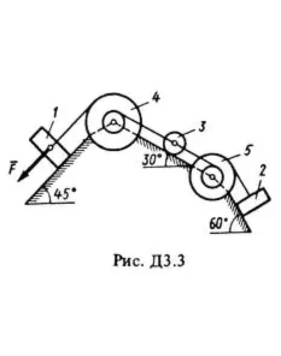 Механическая система состоит из грузов 1 и 2 (коэффициент трения грузов о плоскость F = 0,1), цилиндрического сплошного однородного катка 3 и ступенчатых шкивов 4 и 5 с радиусами ступеней R4 = 0,3 м, r4 = 0,1 м, R5 = 0,2 м, r5 = 0,1 м (массу каждого шкива считать равномерно распределенной по его внешнему ободу) (рис. Д3.0-Д3.9, табл. Д3). Тела системы соединены друг с другом нитями, намотанными на шкивы; участки нитей параллельны соответствующим плоскостям. Под действием силы F = f(x), зависящей от перемещения точки приложения силы, система приходит в движение из состояния покоя. При движении системы на шкивы 4 и 5 действуют постоянные моменты сил сопротивлений, равные соответственно M4 и M5. Определить значение искомой величины в тот момент времени, когда перемещение точки приложения силы F равно s1.