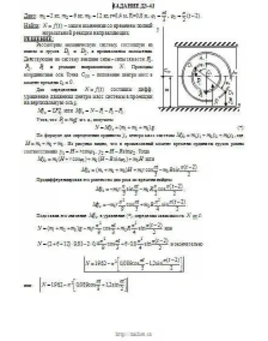При движении грузов угол φ1 = ∠A2C3D1изменяется по закону φ1 = f1(t), а угол φ2 = ∠A2C3D2 — по закону φ2 = f2(t). В табл. ДЗ эти зависимости даны отдельно для рис. 0—4 и 5—9, где φ выражено в радианах, t — в секундах. Считая грузы материальными точками и пренебрегая всеми сопротивлениями, определить закон изменения со временем величины, указанной в таблице в столбце «Найти», т. е. x3 = t3(t) и N = f(t), где x3 — координата центра C3 плиты (зависимость x3 = f3(t) определяет закон движения плиты), N — полная нормальная реакция направляющих.