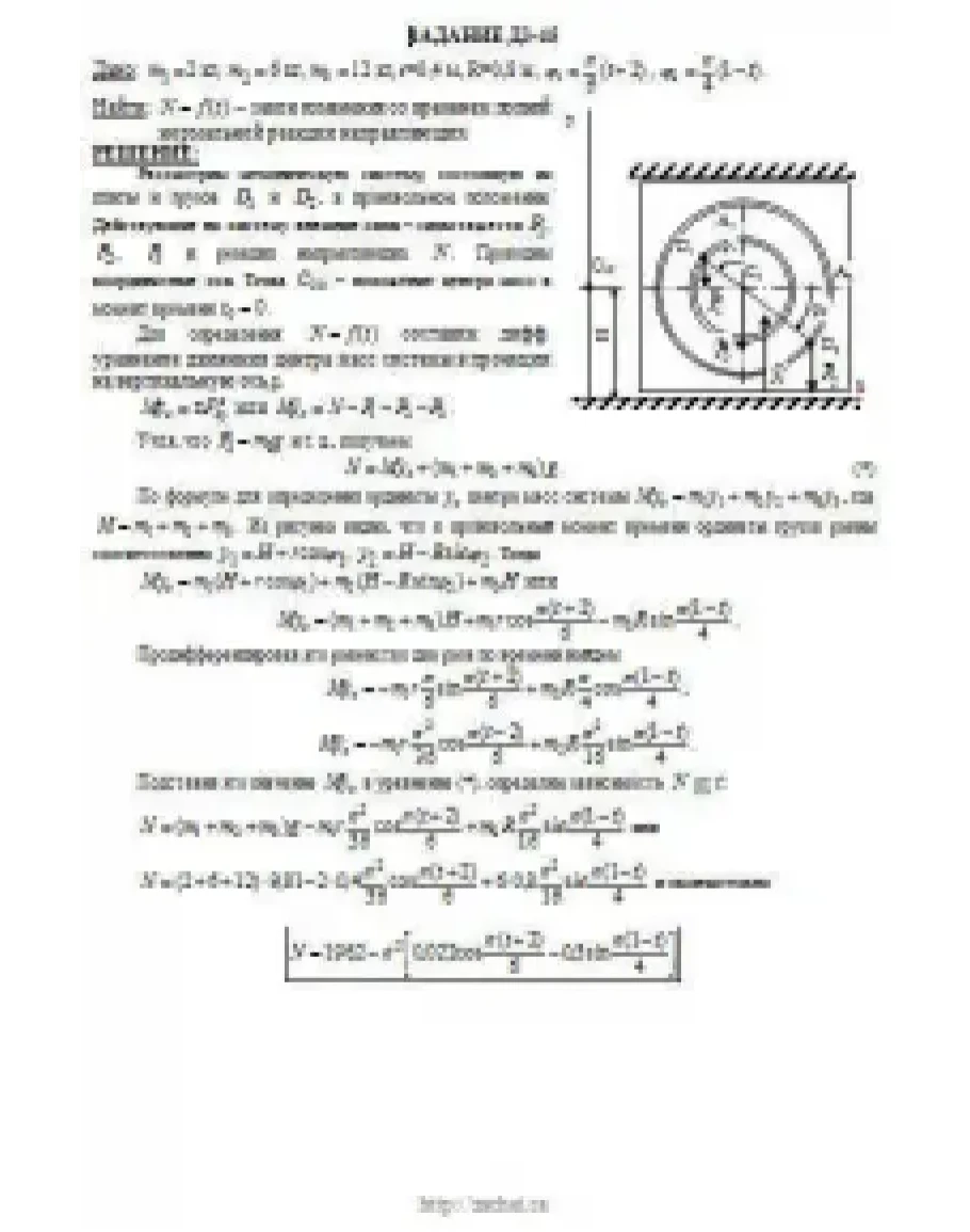 При движении грузов угол φ1 = ∠A2C3D1изменяется по закону φ1 = f1(t), а угол φ2 = ∠A2C3D2 — по закону φ2 = f2(t). В табл. ДЗ эти зависимости даны отдельно для рис. 0—4 и 5—9, где φ выражено в радианах, t — в секундах. Считая грузы материальными точками и пренебрегая всеми сопротивлениями, определить закон изменения со временем величины, указанной в таблице в столбце «Найти», т. е. x3 = t3(t) и N = f(t), где x3 — координата центра C3 плиты (зависимость x3 = f3(t) определяет закон движения плиты), N — полная нормальная реакция направляющих.