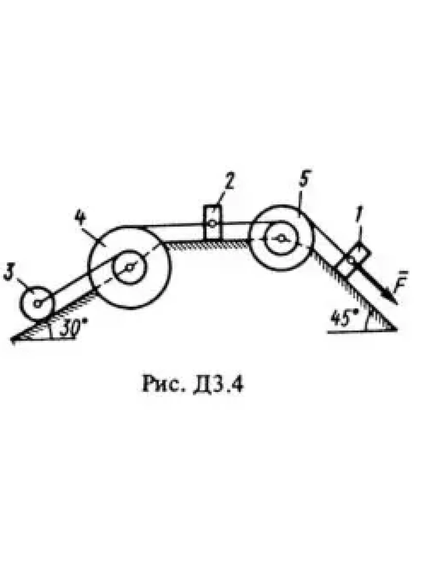 Механическая система состоит из грузов 1 и 2 (коэффициент трения грузов о плоскость F = 0,1), цилиндрического сплошного однородного катка 3 и ступенчатых шкивов 4 и 5 с радиусами ступеней R4 = 0,3 м, r4 = 0,1 м, R5 = 0,2 м, r5 = 0,1 м (массу каждого шкива считать равномерно распределенной по его внешнему ободу) (рис. Д3.0-Д3.9, табл. Д3). Тела системы соединены друг с другом нитями, намотанными на шкивы; участки нитей параллельны соответствующим плоскостям. Под действием силы F = f(x), зависящей от перемещения точки приложения силы, система приходит в движение из состояния покоя. При движении системы на шкивы 4 и 5 действуют постоянные моменты сил сопротивлений, равные соответственно M4 и M5. Определить значение искомой величины в тот момент времени, когда перемещение точки приложения силы F равно s1.