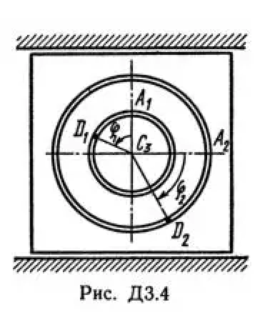 Механическая система состоит из грузов D1 массой m1 = 2 кг и D2 массой m2 = 6 кг и из прямоугольной вертикальной плиты массой m3 = 12 кг, движущейся вдоль горизонтальных направляющих (рис. Д3.0 — Д3.9, табл. Д3). В момент времени t0 = 0, когда система находилась в покое, под действием внутренних сил грузы начинают двигаться по желобам, представляющим собой окружности радиусов r = 0,4 м и R = 0,8 м.