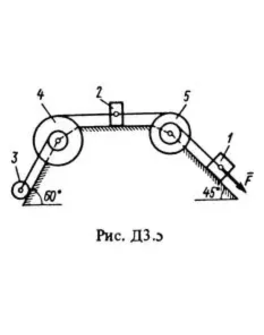 Механическая система состоит из грузов 1 и 2 (коэффициент трения грузов о плоскость F = 0,1), цилиндрического сплошного однородного катка 3 и ступенчатых шкивов 4 и 5 с радиусами ступеней R4 = 0,3 м, r4 = 0,1 м, R5 = 0,2 м, r5 = 0,1 м (массу каждого шкива считать равномерно распределенной по его внешнему ободу) (рис. Д3.0-Д3.9, табл. Д3). Тела системы соединены друг с другом нитями, намотанными на шкивы; участки нитей параллельны соответствующим плоскостям. Под действием силы F = f(x), зависящей от перемещения точки приложения силы, система приходит в движение из состояния покоя. При движении системы на шкивы 4 и 5 действуют постоянные моменты сил сопротивлений, равные соответственно M4 и M5. Определить значение искомой величины в тот момент времени, когда перемещение точки приложения силы F равно s1.