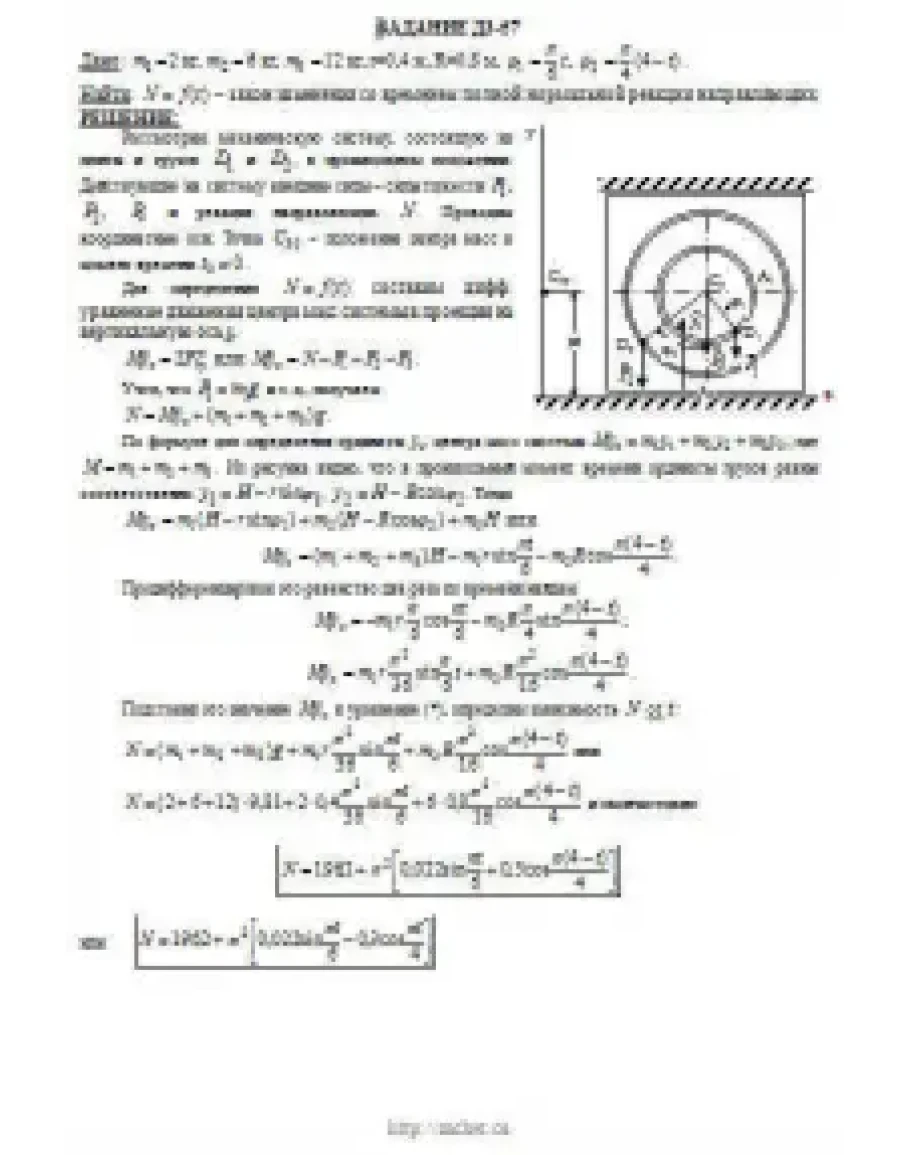 При движении грузов угол φ1 = ∠A2C3D1изменяется по закону φ1 = f1(t), а угол φ2 = ∠A2C3D2 — по закону φ2 = f2(t). В табл. ДЗ эти зависимости даны отдельно для рис. 0—4 и 5—9, где φ выражено в радианах, t — в секундах. Считая грузы материальными точками и пренебрегая всеми сопротивлениями, определить закон изменения со временем величины, указанной в таблице в столбце «Найти», т. е. x3 = t3(t) и N = f(t), где x3 — координата центра C3 плиты (зависимость x3 = f3(t) определяет закон движения плиты), N — полная нормальная реакция направляющих.