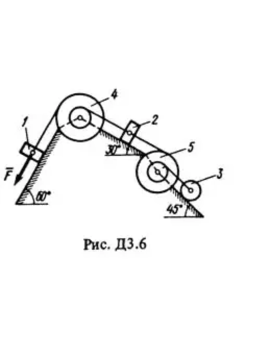 Механическая система состоит из грузов 1 и 2 (коэффициент трения грузов о плоскость F = 0,1), цилиндрического сплошного однородного катка 3 и ступенчатых шкивов 4 и 5 с радиусами ступеней R4 = 0,3 м, r4 = 0,1 м, R5 = 0,2 м, r5 = 0,1 м (массу каждого шкива считать равномерно распределенной по его внешнему ободу) (рис. Д3.0-Д3.9, табл. Д3). Тела системы соединены друг с другом нитями, намотанными на шкивы; участки нитей параллельны соответствующим плоскостям. Под действием силы F = f(x), зависящей от перемещения точки приложения силы, система приходит в движение из состояния покоя. При движении системы на шкивы 4 и 5 действуют постоянные моменты сил сопротивлений, равные соответственно M4 и M5. Определить значение искомой величины в тот момент времени, когда перемещение точки приложения силы F равно s1.