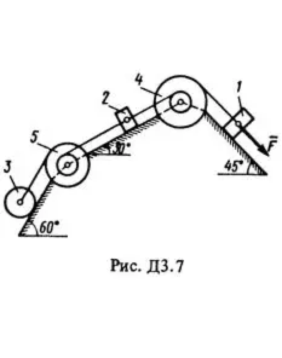 Механическая система состоит из грузов 1 и 2 (коэффициент трения грузов о плоскость F = 0,1), цилиндрического сплошного однородного катка 3 и ступенчатых шкивов 4 и 5 с радиусами ступеней R4 = 0,3 м, r4 = 0,1 м, R5 = 0,2 м, r5 = 0,1 м (массу каждого шкива считать равномерно распределенной по его внешнему ободу) (рис. Д3.0-Д3.9, табл. Д3). Тела системы соединены друг с другом нитями, намотанными на шкивы; участки нитей параллельны соответствующим плоскостям. Под действием силы F = f(x), зависящей от перемещения точки приложения силы, система приходит в движение из состояния покоя. При движении системы на шкивы 4 и 5 действуют постоянные моменты сил сопротивлений, равные соответственно M4 и M5. Определить значение искомой величины в тот момент времени, когда перемещение точки приложения силы F равно s1.