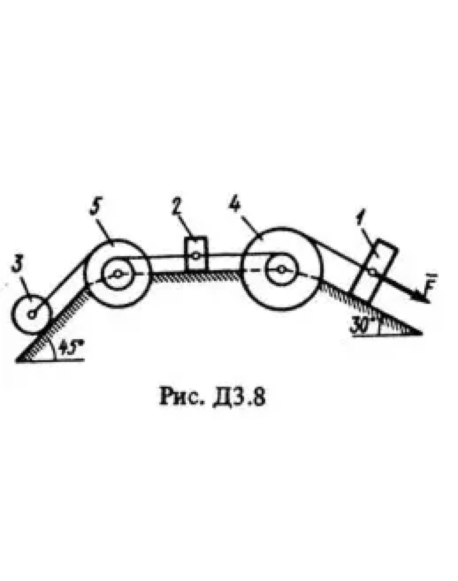 Механическая система состоит из грузов 1 и 2 (коэффициент трения грузов о плоскость F = 0,1), цилиндрического сплошного однородного катка 3 и ступенчатых шкивов 4 и 5 с радиусами ступеней R4 = 0,3 м, r4 = 0,1 м, R5 = 0,2 м, r5 = 0,1 м (массу каждого шкива считать равномерно распределенной по его внешнему ободу) (рис. Д3.0-Д3.9, табл. Д3). Тела системы соединены друг с другом нитями, намотанными на шкивы; участки нитей параллельны соответствующим плоскостям. Под действием силы F = f(x), зависящей от перемещения точки приложения силы, система приходит в движение из состояния покоя. При движении системы на шкивы 4 и 5 действуют постоянные моменты сил сопротивлений, равные соответственно M4 и M5. Определить значение искомой величины в тот момент времени, когда перемещение точки приложения силы F равно s1.