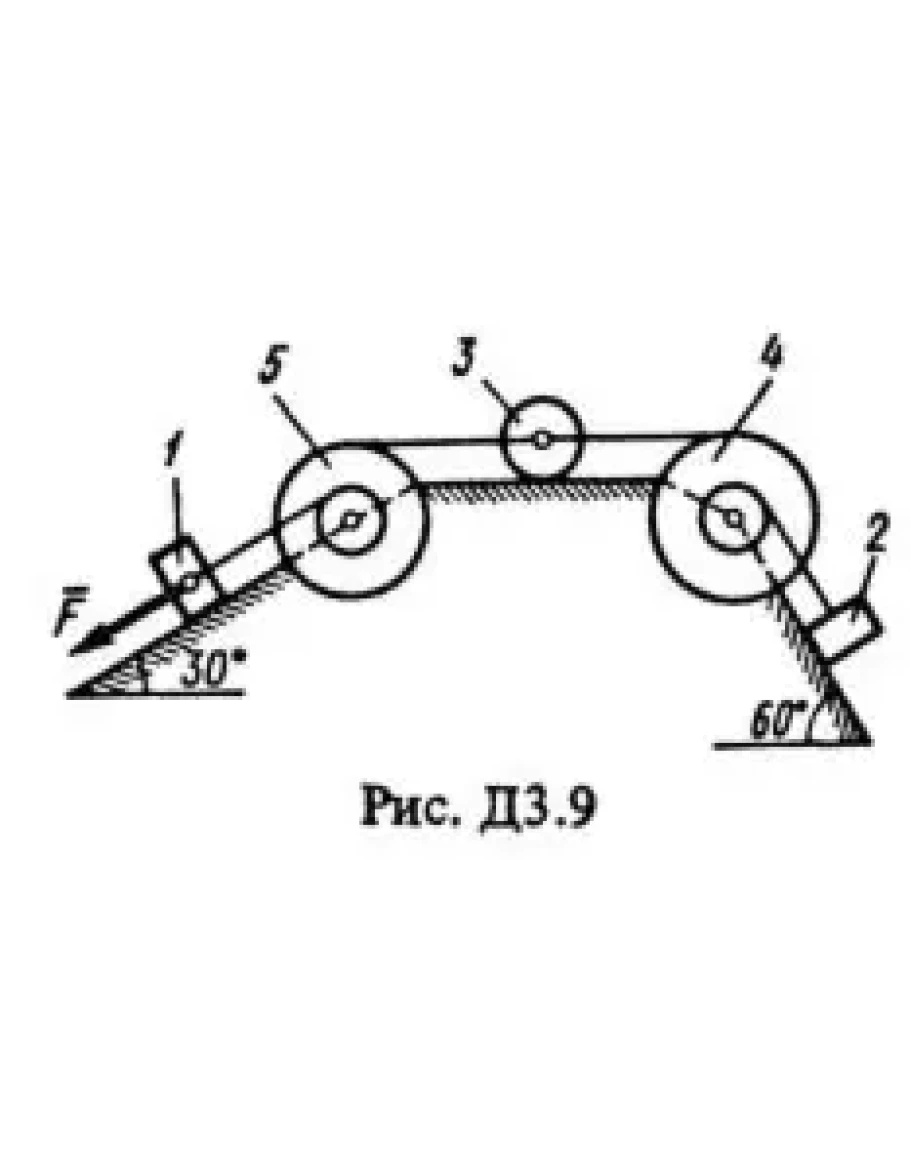 Механическая система состоит из грузов 1 и 2 (коэффициент трения грузов о плоскость F = 0,1), цилиндрического сплошного однородного катка 3 и ступенчатых шкивов 4 и 5 с радиусами ступеней R4 = 0,3 м, r4 = 0,1 м, R5 = 0,2 м, r5 = 0,1 м (массу каждого шкива считать равномерно распределенной по его внешнему ободу) (рис. Д3.0-Д3.9, табл. Д3). Тела системы соединены друг с другом нитями, намотанными на шкивы; участки нитей параллельны соответствующим плоскостям. Под действием силы F = f(x), зависящей от перемещения точки приложения силы, система приходит в движение из состояния покоя. При движении системы на шкивы 4 и 5 действуют постоянные моменты сил сопротивлений, равные соответственно M4 и M5. Определить значение искомой величины в тот момент времени, когда перемещение точки приложения силы F равно s1.