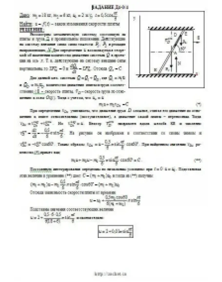 Механическая система состоит из прямоугольной вертикальной плиты 1 массой m1 = 18 кг, движущейся вдоль горизонтальных направляющих, и груза D массой m2 = 6 кг (рис. Д4.0 — Д4.9, табл. Д4). В момент времени t0 = 0, когда скорость плиты u0 = 2 м/с, груз под действием внутренних сил начинает двигаться по желобу плиты. На рис. 0—3 желоб КЕ прямолинейный и при движении груза расстояние s = AD изменяется по закону s = f1(t), а на рис. 4—9 желоб — окружность радиуса R = 0,8 м и при движении груза угол φ = ∟AC1D изменяется по закону ф = f2(t). В табл. Д4 эти зависимости даны отдельно для рис. 0 и 1, для рис. 2 и 3 и т. д., где s выражено в метрах, φ — в радианах» t — в секундах. Считая груз материальной точкой и пренебрегая всеми сопротивлениями, определить зависимость u = f(t), т. е. скорость плиты как функцию времени.
