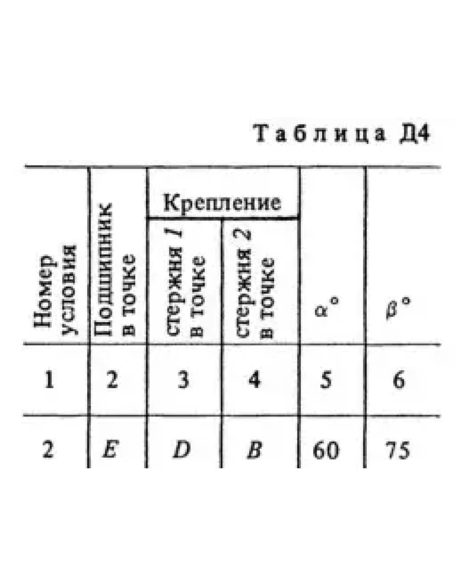 Вертикальный вал AK (рис. Д4.0-Д4.9, табл. Д4), вращающийся с постоянной угловой скоростью ω = 10 с-1, закреплен подпятником в точке А и цилиндрическим подшипником в точке, указанной в табл. Д4 в столбце 2 (AB = BD = DE = EK = b). К валу жестко прикреплены невесомый стержень 1 длиной l1 = 0,4 м с точечной массой m1 = 6 кг на конце и однородный стержень 2 длиной l2 = 0,6 м, имеющий массу m2 = 4 кг; оба стержня лежат в одной плоскости. Точки крепления стержней к валу указаны в таблице в столбцах 3 и 4, а углы α и β – в столбцах 5 и 6. Пренебрегая весом вала, определить реакции подпятника и подшипника. При окончательных подсчетах принять b = 0,4 м.