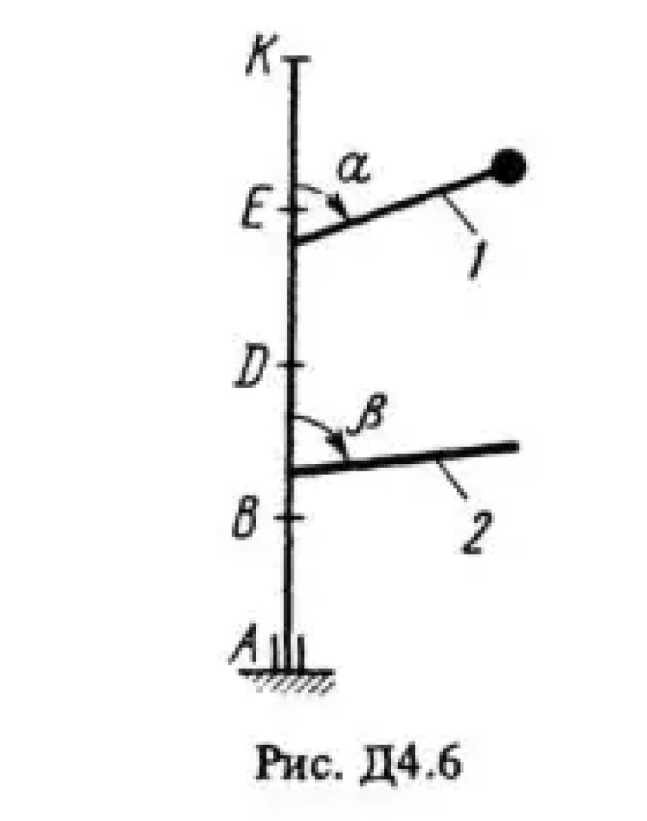 Вертикальный вал AK (рис. Д4.0-Д4.9, табл. Д4), вращающийся с постоянной угловой скоростью ω = 10 с-1, закреплен подпятником в точке А и цилиндрическим подшипником в точке, указанной в табл. Д4 в столбце 2 (AB = BD = DE = EK = b). К валу жестко прикреплены невесомый стержень 1 длиной l1 = 0,4 м с точечной массой m1 = 6 кг на конце и однородный стержень 2 длиной l2 = 0,6 м, имеющий массу m2 = 4 кг; оба стержня лежат в одной плоскости. Точки крепления стержней к валу указаны в таблице в столбцах 3 и 4, а углы α и β – в столбцах 5 и 6. Пренебрегая весом вала, определить реакции подпятника и подшипника. При окончательных подсчетах принять b = 0,4 м.