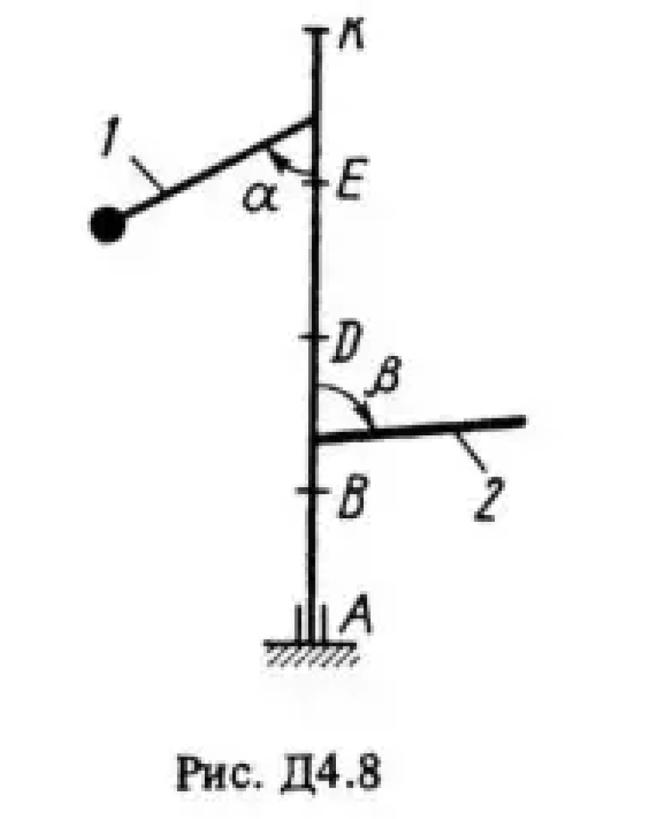 Вертикальный вал AK (рис. Д4.0-Д4.9, табл. Д4), вращающийся с постоянной угловой скоростью ω = 10 с-1, закреплен подпятником в точке А и цилиндрическим подшипником в точке, указанной в табл. Д4 в столбце 2 (AB = BD = DE = EK = b). К валу жестко прикреплены невесомый стержень 1 длиной l1 = 0,4 м с точечной массой m1 = 6 кг на конце и однородный стержень 2 длиной l2 = 0,6 м, имеющий массу m2 = 4 кг; оба стержня лежат в одной плоскости. Точки крепления стержней к валу указаны в таблице в столбцах 3 и 4, а углы α и β – в столбцах 5 и 6. Пренебрегая весом вала, определить реакции подпятника и подшипника. При окончательных подсчетах принять b = 0,4 м.