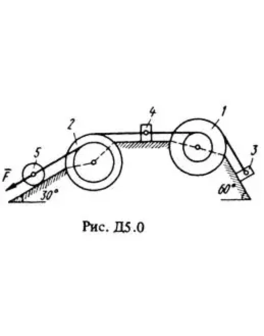 Механическая система состоит из ступенчатых шкивов 1 и2 весом P1 и P2 с радиусами ступеней R1 = R, r1 = 0,4R; R2 = R, r3 = 0,8R (массу каждого шкива считать равномерно распределенной по его внешнему ободу); грузов 3, 4 и сплошного однородного цилиндрического катка 5 весом P3, P4, P5 соответственно (рис. Д5.0-Д5.9 табл. Д5). Тела системы соединены нитями, намотанными на шкивы; участки нитей параллельны соответствующим плоскостям. Грузы Скользят по плоскостям без трения, а катки катяться без скольжения. Кроме сил тяжести на одно из тел системы действует постоянная сила F, а на шкивы 1 и 2 при их вращении действуют постоянные моменты сил сопротивления, равные соответственно M1 и M2. Составить для данной системы уравнение Лагранжа и определить из него величину, указанную в таблице в столбце «Найти», где обозначено: ε1, ε2 – угловые ускорения шкивов 1 и 2; а3, а4, аС5 – ускорения грузов 3, 4 и центра масс катка 5 соответственно. Когда в задаче надо определить ε1, ε2, считать R = 0,25 м. Тот из грузов 3, 4 вес которого равен нулю, на чертеже не изображать. Шкивы 1 и 2 всегда входят в систему.