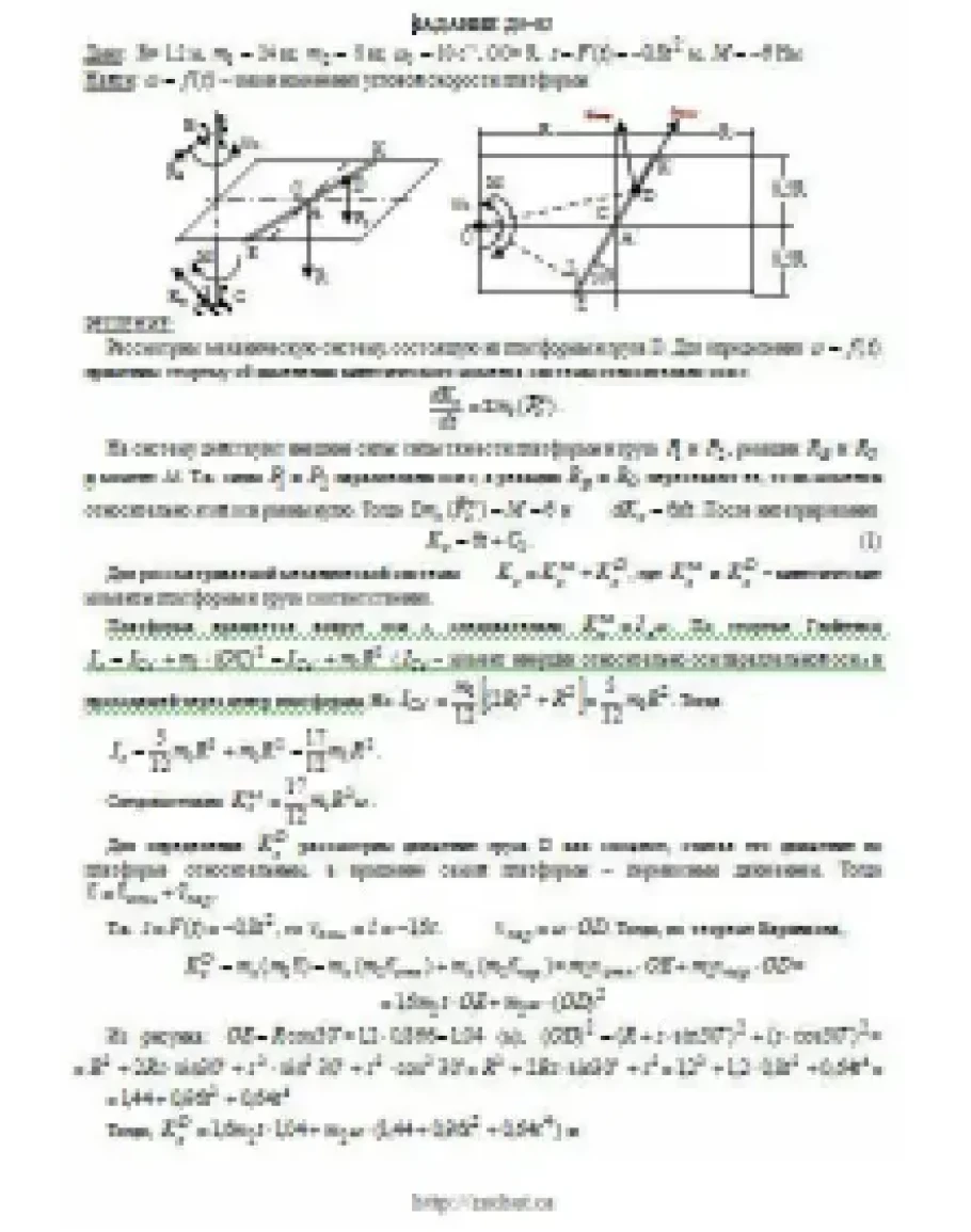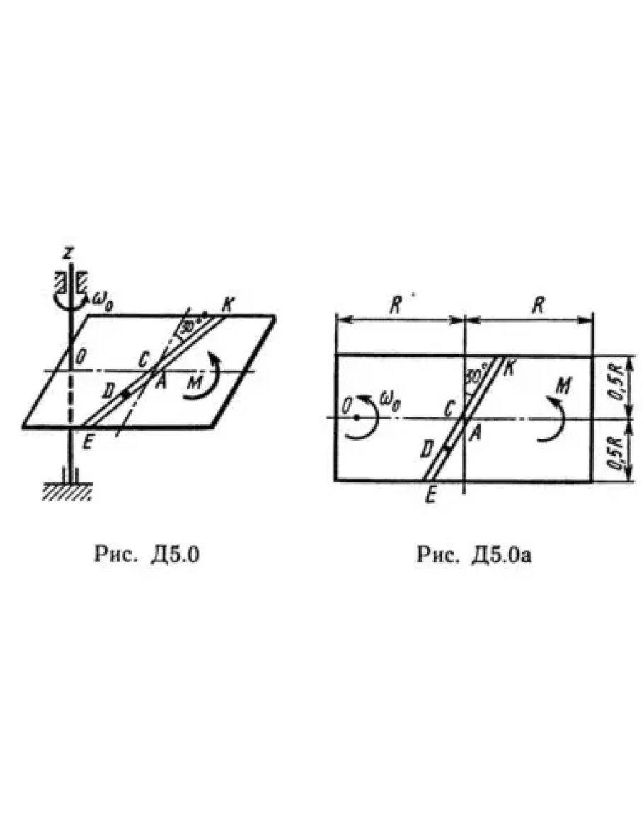 Однородная горизонтальная платформа (круглая радиуса R или прямоугольная со сторонами R и 2R, где R = 1,2 м) массой m1 = 24 кг вращается с угловой скоростью ω0 = 10 с-1 вокруг вертикальной оси z, отстоящей от центра масс C платформы на расстоянии OC = b (рис. Д5.0 —Д5.9, табл. Д5); размеры для всех прямоугольных платформ показаны на рис. Д5.0а (вид сверху). В момент времени t0 = 0 по желобу платформы начинает двигаться (под действием внутренних сил) груз D массой m2 = 8 кг по закону s = AD = F(t) где s выражено в метрах, t — в секундах. Одновременно на платформы начинает действовать пара сил с моментом М (задан в ньютонометрах; при М<0 его направление противоположно показанному на рисунках). Определить, пренебрегая массой вала, зависимость ω = f(t), т. е. угловую скорость платформы, как функцию времени. На всех рисунках груз D показан в положении, при котором s>0 (когда s<0, груз находится по другую сторону от точки А). Изображая чертеж решаемой задачи, провести ось z на заданном расстоянии OC = b от центра С.