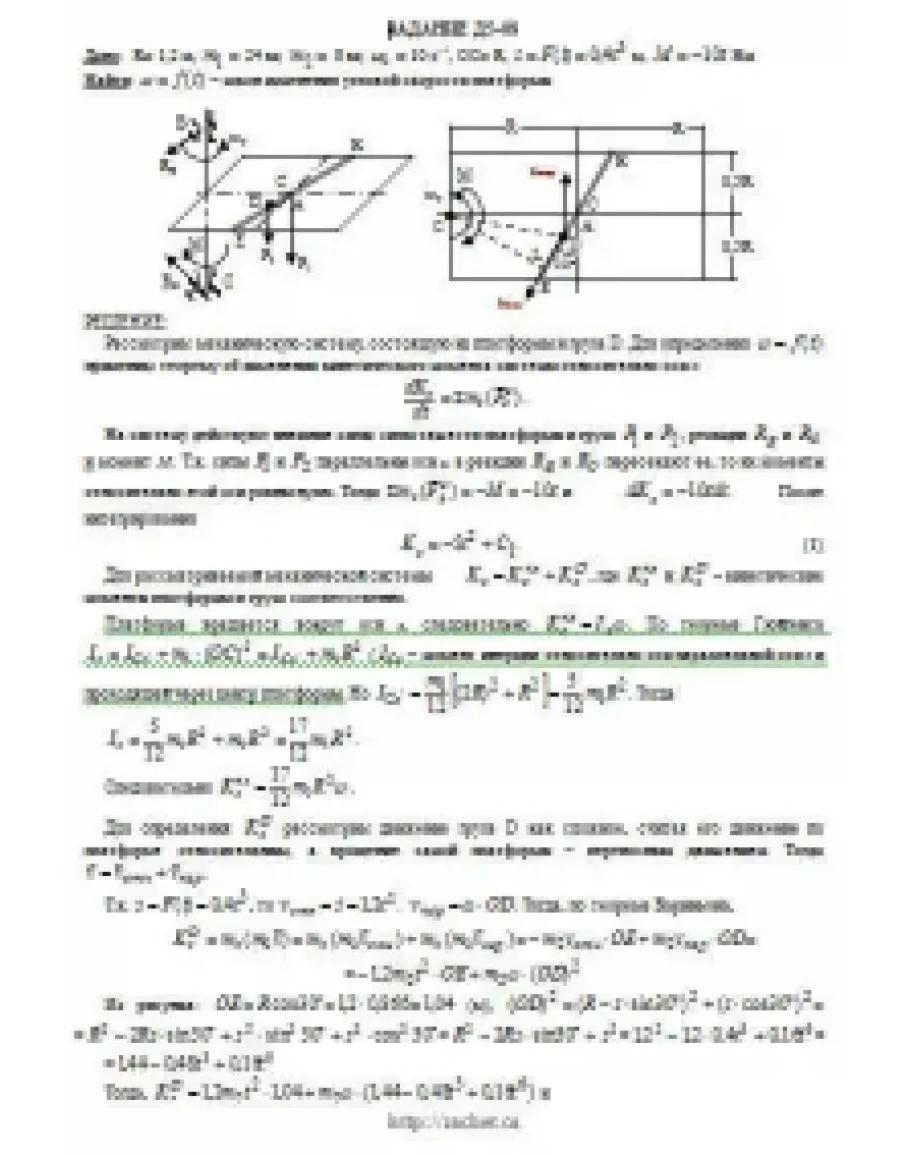 Однородная горизонтальная платформа (круглая радиуса R или прямоугольная со сторонами R и 2R, где R = 1,2 м) массой m1 = 24 кг вращается с угловой скоростью ω0 = 10 с-1 вокруг вертикальной оси z, отстоящей от центра масс C платформы на расстоянии OC = b (рис. Д5.0 —Д5.9, табл. Д5); размеры для всех прямоугольных платформ показаны на рис. Д5.0а (вид сверху). В момент времени t0 = 0 по желобу платформы начинает двигаться (под действием внутренних сил) груз D массой m2 = 8 кг по закону s = AD = F(t) где s выражено в метрах, t — в секундах. Одновременно на платформы начинает действовать пара сил с моментом М (задан в ньютонометрах; при М<0 его направление противоположно показанному на рисунках). Определить, пренебрегая массой вала, зависимость ω = f(t), т. е. угловую скорость платформы, как функцию времени. На всех рисунках груз D показан в положении, при котором s>0 (когда s<0, груз находится по другую сторону от точки А). Изображая чертеж решаемой задачи, провести ось z на заданном расстоянии OC = b от центра С.