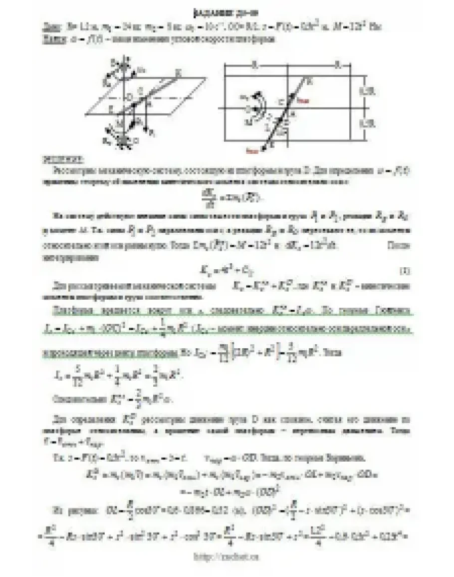 Однородная горизонтальная платформа (круглая радиуса R или прямоугольная со сторонами R и 2R, где R = 1,2 м) массой m1 = 24 кг вращается с угловой скоростью ω0 = 10 с-1 вокруг вертикальной оси z, отстоящей от центра масс C платформы на расстоянии OC = b (рис. Д5.0 —Д5.9, табл. Д5); размеры для всех прямоугольных платформ показаны на рис. Д5.0а (вид сверху). В момент времени t0 = 0 по желобу платформы начинает двигаться (под действием внутренних сил) груз D массой m2 = 8 кг по закону s = AD = F(t) где s выражено в метрах, t — в секундах. Одновременно на платформы начинает действовать пара сил с моментом М (задан в ньютонометрах; при М<0 его направление противоположно показанному на рисунках). Определить, пренебрегая массой вала, зависимость ω = f(t), т. е. угловую скорость платформы, как функцию времени. На всех рисунках груз D показан в положении, при котором s>0 (когда s<0, груз находится по другую сторону от точки А). Изображая чертеж решаемой задачи, провести ось z на заданном расстоянии OC = b от центра С.