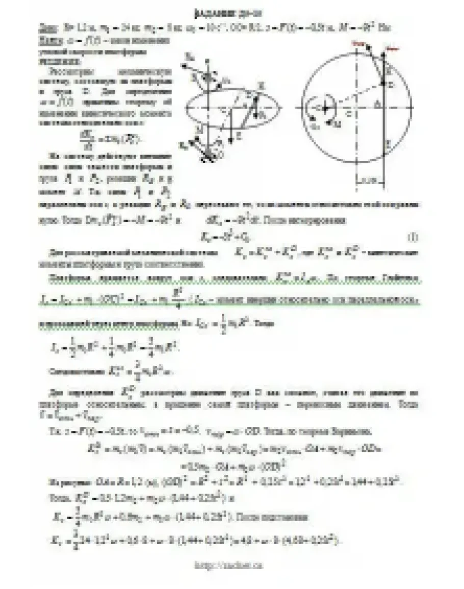 Однородная горизонтальная платформа (круглая радиуса R или прямоугольная со сторонами R и 2R, где R = 1,2 м) массой m1 = 24 кг вращается с угловой скоростью ω0 = 10 с-1 вокруг вертикальной оси z, отстоящей от центра масс C платформы на расстоянии OC = b (рис. Д5.0 —Д5.9, табл. Д5); размеры для всех прямоугольных платформ показаны на рис. Д5.0а (вид сверху). В момент времени t0 = 0 по желобу платформы начинает двигаться (под действием внутренних сил) груз D массой m2 = 8 кг по закону s = AD = F(t) где s выражено в метрах, t — в секундах. Одновременно на платформы начинает действовать пара сил с моментом М (задан в ньютонометрах; при М<0 его направление противоположно показанному на рисунках). Определить, пренебрегая массой вала, зависимость ω = f(t), т. е. угловую скорость платформы, как функцию времени. На всех рисунках груз D показан в положении, при котором s>0 (когда s<0, груз находится по другую сторону от точки А). Изображая чертеж решаемой задачи, провести ось z на заданном расстоянии OC = b от центра С.