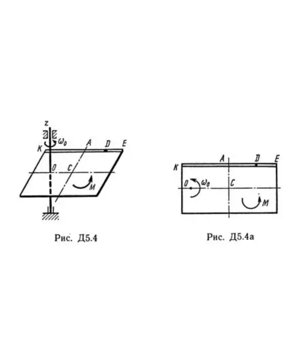 Однородная горизонтальная платформа (круглая радиуса R или прямоугольная со сторонами R и 2R, где R = 1,2 м) массой m1 = 24 кг вращается с угловой скоростью ω0 = 10 с-1 вокруг вертикальной оси z, отстоящей от центра масс C платформы на расстоянии OC = b (рис. Д5.0 —Д5.9, табл. Д5); размеры для всех прямоугольных платформ показаны на рис. Д5.0а (вид сверху). В момент времени t0 = 0 по желобу платформы начинает двигаться (под действием внутренних сил) груз D массой m2 = 8 кг по закону s = AD = F(t) где s выражено в метрах, t — в секундах. Одновременно на платформы начинает действовать пара сил с моментом М (задан в ньютонометрах; при М<0 его направление противоположно показанному на рисунках). Определить, пренебрегая массой вала, зависимость ω = f(t), т. е. угловую скорость платформы, как функцию времени. На всех рисунках груз D показан в положении, при котором s>0 (когда s<0, груз находится по другую сторону от точки А). Изображая чертеж решаемой задачи, провести ось z на заданном расстоянии OC = b от центра С.