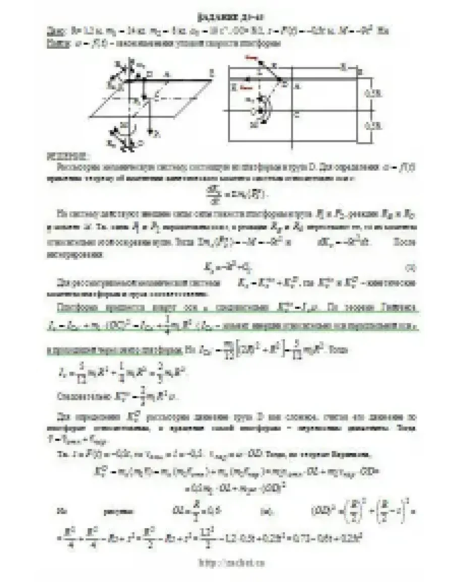 Однородная горизонтальная платформа (круглая радиуса R или прямоугольная со сторонами R и 2R, где R = 1,2 м) массой m1 = 24 кг вращается с угловой скоростью ω0 = 10 с-1 вокруг вертикальной оси z, отстоящей от центра масс C платформы на расстоянии OC = b (рис. Д5.0 —Д5.9, табл. Д5); размеры для всех прямоугольных платформ показаны на рис. Д5.0а (вид сверху). В момент времени t0 = 0 по желобу платформы начинает двигаться (под действием внутренних сил) груз D массой m2 = 8 кг по закону s = AD = F(t) где s выражено в метрах, t — в секундах. Одновременно на платформы начинает действовать пара сил с моментом М (задан в ньютонометрах; при М<0 его направление противоположно показанному на рисунках). Определить, пренебрегая массой вала, зависимость ω = f(t), т. е. угловую скорость платформы, как функцию времени. На всех рисунках груз D показан в положении, при котором s>0 (когда s<0, груз находится по другую сторону от точки А). Изображая чертеж решаемой задачи, провести ось z на заданном расстоянии OC = b от центра С.