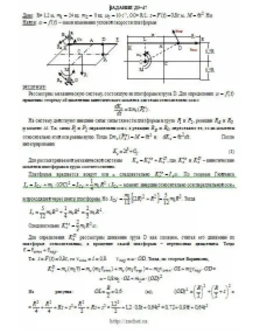 Однородная горизонтальная платформа (круглая радиуса R или прямоугольная со сторонами R и 2R, где R = 1,2 м) массой m1 = 24 кг вращается с угловой скоростью ω0 = 10 с-1 вокруг вертикальной оси z, отстоящей от центра масс C платформы на расстоянии OC = b (рис. Д5.0 —Д5.9, табл. Д5); размеры для всех прямоугольных платформ показаны на рис. Д5.0а (вид сверху). В момент времени t0 = 0 по желобу платформы начинает двигаться (под действием внутренних сил) груз D массой m2 = 8 кг по закону s = AD = F(t) где s выражено в метрах, t — в секундах. Одновременно на платформы начинает действовать пара сил с моментом М (задан в ньютонометрах; при М<0 его направление противоположно показанному на рисунках). Определить, пренебрегая массой вала, зависимость ω = f(t), т. е. угловую скорость платформы, как функцию времени. На всех рисунках груз D показан в положении, при котором s>0 (когда s<0, груз находится по другую сторону от точки А). Изображая чертеж решаемой задачи, провести ось z на заданном расстоянии OC = b от центра С.