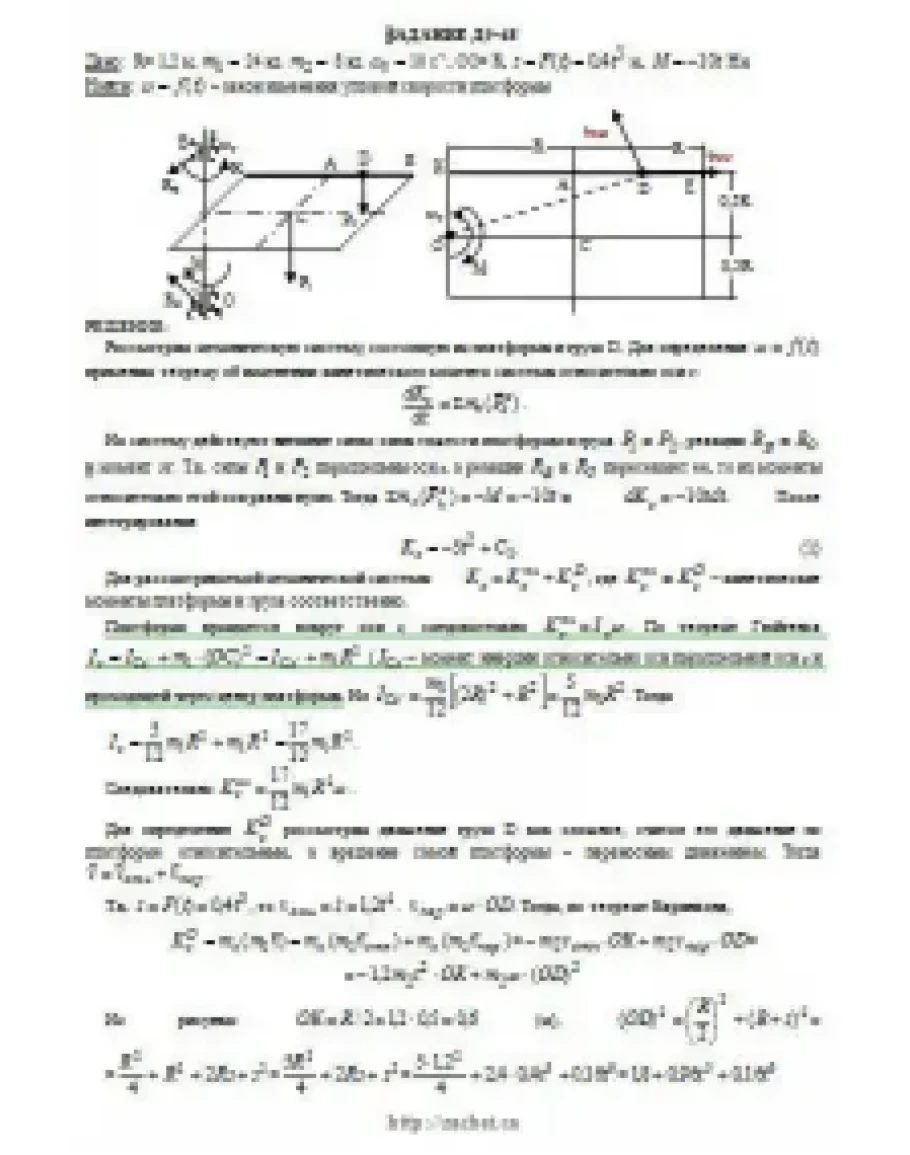 Однородная горизонтальная платформа (круглая радиуса R или прямоугольная со сторонами R и 2R, где R = 1,2 м) массой m1 = 24 кг вращается с угловой скоростью ω0 = 10 с-1 вокруг вертикальной оси z, отстоящей от центра масс C платформы на расстоянии OC = b (рис. Д5.0 —Д5.9, табл. Д5); размеры для всех прямоугольных платформ показаны на рис. Д5.0а (вид сверху). В момент времени t0 = 0 по желобу платформы начинает двигаться (под действием внутренних сил) груз D массой m2 = 8 кг по закону s = AD = F(t) где s выражено в метрах, t — в секундах. Одновременно на платформы начинает действовать пара сил с моментом М (задан в ньютонометрах; при М<0 его направление противоположно показанному на рисунках). Определить, пренебрегая массой вала, зависимость ω = f(t), т. е. угловую скорость платформы, как функцию времени. На всех рисунках груз D показан в положении, при котором s>0 (когда s<0, груз находится по другую сторону от точки А). Изображая чертеж решаемой задачи, провести ось z на заданном расстоянии OC = b от центра С.