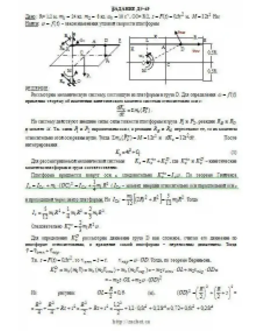Однородная горизонтальная платформа (круглая радиуса R или прямоугольная со сторонами R и 2R, где R = 1,2 м) массой m1 = 24 кг вращается с угловой скоростью ω0 = 10 с-1 вокруг вертикальной оси z, отстоящей от центра масс C платформы на расстоянии OC = b (рис. Д5.0 —Д5.9, табл. Д5); размеры для всех прямоугольных платформ показаны на рис. Д5.0а (вид сверху). В момент времени t0 = 0 по желобу платформы начинает двигаться (под действием внутренних сил) груз D массой m2 = 8 кг по закону s = AD = F(t) где s выражено в метрах, t — в секундах. Одновременно на платформы начинает действовать пара сил с моментом М (задан в ньютонометрах; при М<0 его направление противоположно показанному на рисунках). Определить, пренебрегая массой вала, зависимость ω = f(t), т. е. угловую скорость платформы, как функцию времени. На всех рисунках груз D показан в положении, при котором s>0 (когда s<0, груз находится по другую сторону от точки А). Изображая чертеж решаемой задачи, провести ось z на заданном расстоянии OC = b от центра С.
