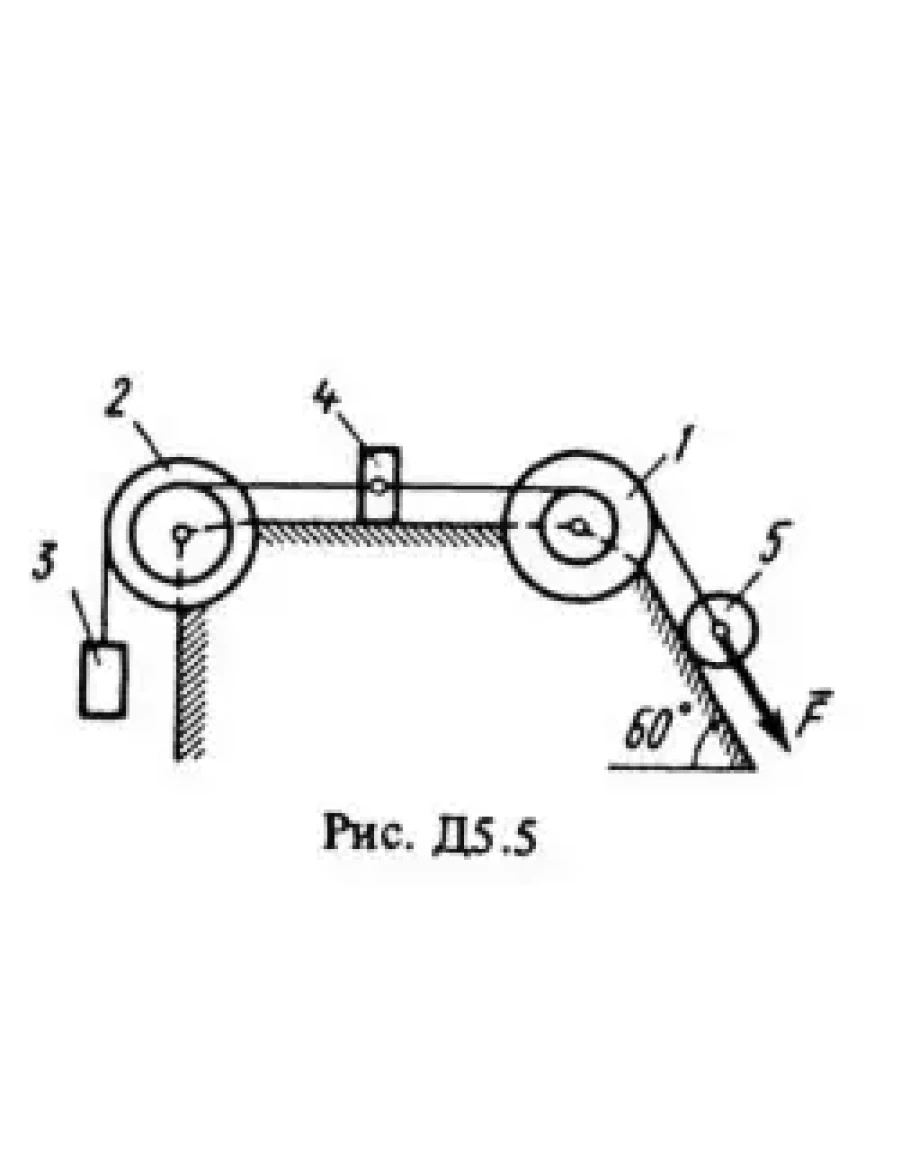 Механическая система состоит из ступенчатых шкивов 1 и2 весом P1 и P2 с радиусами ступеней R1 = R, r1 = 0,4R; R2 = R, r3 = 0,8R (массу каждого шкива считать равномерно распределенной по его внешнему ободу); грузов 3, 4 и сплошного однородного цилиндрического катка 5 весом P3, P4, P5 соответственно (рис. Д5.0-Д5.9 табл. Д5). Тела системы соединены нитями, намотанными на шкивы; участки нитей параллельны соответствующим плоскостям. Грузы Скользят по плоскостям без трения, а катки катяться без скольжения. Кроме сил тяжести на одно из тел системы действует постоянная сила F, а на шкивы 1 и 2 при их вращении действуют постоянные моменты сил сопротивления, равные соответственно M1 и M2. Составить для данной системы уравнение Лагранжа и определить из него величину, указанную в таблице в столбце «Найти», где обозначено: ε1, ε2 – угловые ускорения шкивов 1 и 2; а3, а4, аС5 – ускорения грузов 3, 4 и центра масс катка 5 соответственно. Когда в задаче надо определить ε1, ε2, считать R = 0,25 м. Тот из грузов 3, 4 вес которого равен нулю, на чертеже не изображать. Шкивы 1 и 2 всегда входят в систему.