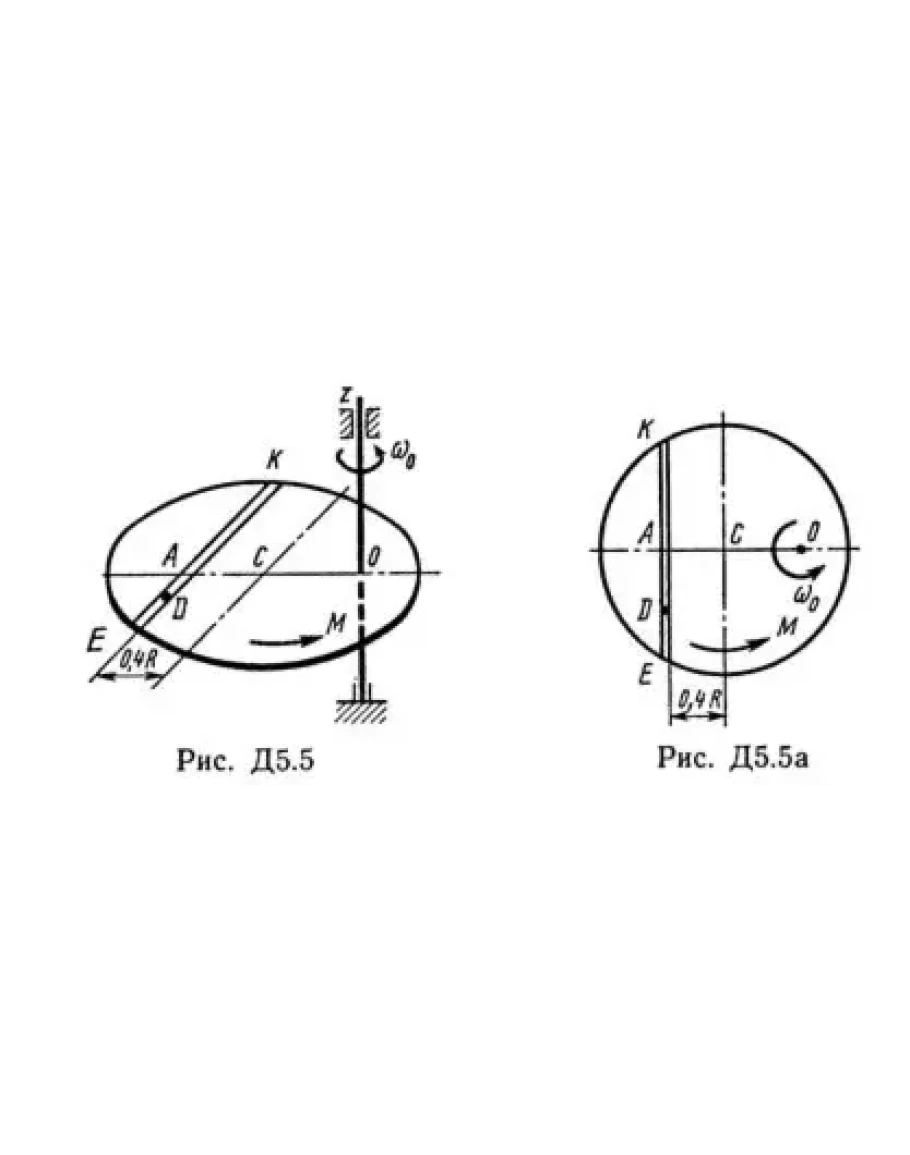 Однородная горизонтальная платформа (круглая радиуса R или прямоугольная со сторонами R и 2R, где R = 1,2 м) массой m1 = 24 кг вращается с угловой скоростью ω0 = 10 с-1 вокруг вертикальной оси z, отстоящей от центра масс C платформы на расстоянии OC = b (рис. Д5.0 —Д5.9, табл. Д5); размеры для всех прямоугольных платформ показаны на рис. Д5.0а (вид сверху). В момент времени t0 = 0 по желобу платформы начинает двигаться (под действием внутренних сил) груз D массой m2 = 8 кг по закону s = AD = F(t) где s выражено в метрах, t — в секундах. Одновременно на платформы начинает действовать пара сил с моментом М (задан в ньютонометрах; при М<0 его направление противоположно показанному на рисунках). Определить, пренебрегая массой вала, зависимость ω = f(t), т. е. угловую скорость платформы, как функцию времени. На всех рисунках груз D показан в положении, при котором s>0 (когда s<0, груз находится по другую сторону от точки А). Изображая чертеж решаемой задачи, провести ось z на заданном расстоянии OC = b от центра С.