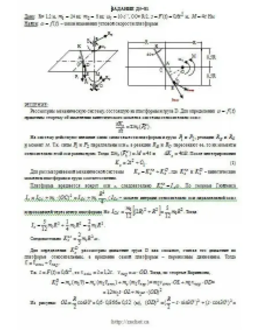 Однородная горизонтальная платформа (круглая радиуса R или прямоугольная со сторонами R и 2R, где R = 1,2 м) массой m1 = 24 кг вращается с угловой скоростью ω0 = 10 с-1 вокруг вертикальной оси z, отстоящей от центра масс C платформы на расстоянии OC = b (рис. Д5.0 —Д5.9, табл. Д5); размеры для всех прямоугольных платформ показаны на рис. Д5.0а (вид сверху). В момент времени t0 = 0 по желобу платформы начинает двигаться (под действием внутренних сил) груз D массой m2 = 8 кг по закону s = AD = F(t) где s выражено в метрах, t — в секундах. Одновременно на платформы начинает действовать пара сил с моментом М (задан в ньютонометрах; при М<0 его направление противоположно показанному на рисунках). Определить, пренебрегая массой вала, зависимость ω = f(t), т. е. угловую скорость платформы, как функцию времени. На всех рисунках груз D показан в положении, при котором s>0 (когда s<0, груз находится по другую сторону от точки А). Изображая чертеж решаемой задачи, провести ось z на заданном расстоянии OC = b от центра С.