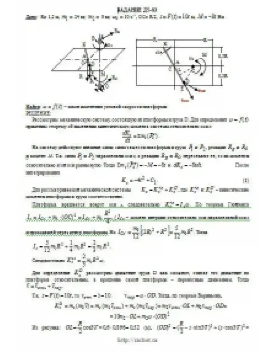 Однородная горизонтальная платформа (круглая радиуса R или прямоугольная со сторонами R и 2R, где R = 1,2 м) массой m1 = 24 кг вращается с угловой скоростью ω0 = 10 с-1 вокруг вертикальной оси z, отстоящей от центра масс C платформы на расстоянии OC = b (рис. Д5.0 —Д5.9, табл. Д5); размеры для всех прямоугольных платформ показаны на рис. Д5.0а (вид сверху). В момент времени t0 = 0 по желобу платформы начинает двигаться (под действием внутренних сил) груз D массой m2 = 8 кг по закону s = AD = F(t) где s выражено в метрах, t — в секундах. Одновременно на платформы начинает действовать пара сил с моментом М (задан в ньютонометрах; при М<0 его направление противоположно показанному на рисунках). Определить, пренебрегая массой вала, зависимость ω = f(t), т. е. угловую скорость платформы, как функцию времени. На всех рисунках груз D показан в положении, при котором s>0 (когда s<0, груз находится по другую сторону от точки А). Изображая чертеж решаемой задачи, провести ось z на заданном расстоянии OC = b от центра С.