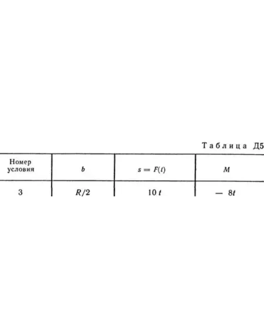Однородная горизонтальная платформа (круглая радиуса R или прямоугольная со сторонами R и 2R, где R = 1,2 м) массой m1 = 24 кг вращается с угловой скоростью ω0 = 10 с-1 вокруг вертикальной оси z, отстоящей от центра масс C платформы на расстоянии OC = b (рис. Д5.0 —Д5.9, табл. Д5); размеры для всех прямоугольных платформ показаны на рис. Д5.0а (вид сверху). В момент времени t0 = 0 по желобу платформы начинает двигаться (под действием внутренних сил) груз D массой m2 = 8 кг по закону s = AD = F(t) где s выражено в метрах, t — в секундах. Одновременно на платформы начинает действовать пара сил с моментом М (задан в ньютонометрах; при М<0 его направление противоположно показанному на рисунках). Определить, пренебрегая массой вала, зависимость ω = f(t), т. е. угловую скорость платформы, как функцию времени. На всех рисунках груз D показан в положении, при котором s>0 (когда s<0, груз находится по другую сторону от точки А). Изображая чертеж решаемой задачи, провести ось z на заданном расстоянии OC = b от центра С.