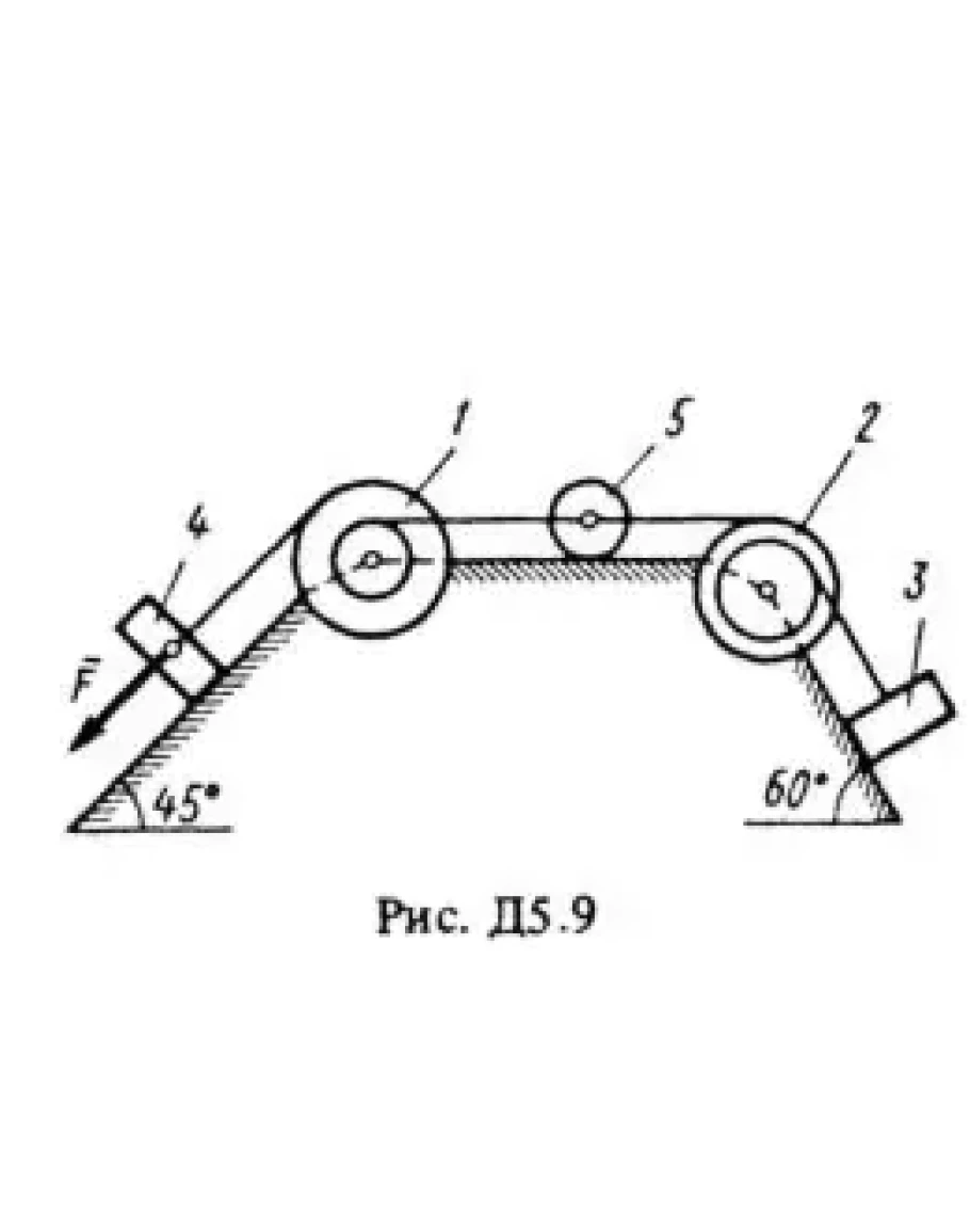 Механическая система состоит из ступенчатых шкивов 1 и2 весом P1 и P2 с радиусами ступеней R1 = R, r1 = 0,4R; R2 = R, r3 = 0,8R (массу каждого шкива считать равномерно распределенной по его внешнему ободу); грузов 3, 4 и сплошного однородного цилиндрического катка 5 весом P3, P4, P5 соответственно (рис. Д5.0-Д5.9 табл. Д5). Тела системы соединены нитями, намотанными на шкивы; участки нитей параллельны соответствующим плоскостям. Грузы Скользят по плоскостям без трения, а катки катяться без скольжения. Кроме сил тяжести на одно из тел системы действует постоянная сила F, а на шкивы 1 и 2 при их вращении действуют постоянные моменты сил сопротивления, равные соответственно M1 и M2. Составить для данной системы уравнение Лагранжа и определить из него величину, указанную в таблице в столбце «Найти», где обозначено: ε1, ε2 – угловые ускорения шкивов 1 и 2; а3, а4, аС5 – ускорения грузов 3, 4 и центра масс катка 5 соответственно. Когда в задаче надо определить ε1, ε2, считать R = 0,25 м. Тот из грузов 3, 4 вес которого равен нулю, на чертеже не изображать. Шкивы 1 и 2 всегда входят в систему.