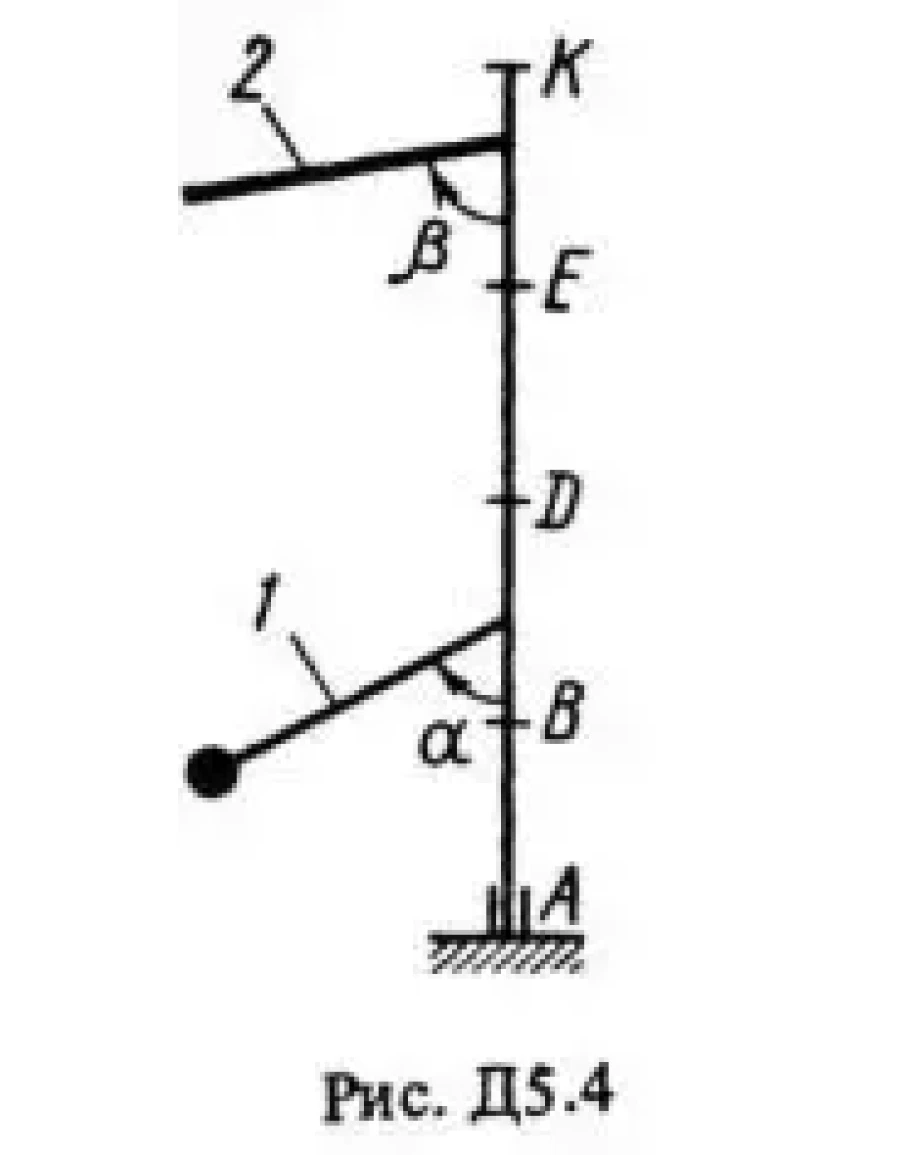 Вертикальный вал AK (рис. Д5.0-Д5.9, табл. Д5), вращающийся с постоянной угловой скоростью ω = 10 с-1, закреплен подпятником в точке А и цилиндрическим подшипником в точке, указанной в табл. Д5 в столбце 2 (AB = BD = DE = EK = b). К валу жестко прикреплены невесомый стержень 1 длиной l1 = 0,4 м с точечной массой m1 = 6 кг на конце и однородный стержень 2 длиной l2 = 0,6 м, имеющий массу m2 = 4 кг; оба стержня лежат в одной плоскости. Точки крепления стержней к валу указаны в таблице в столбцах 3 и 4, а углы α и β – в столбцах 5 и 6.