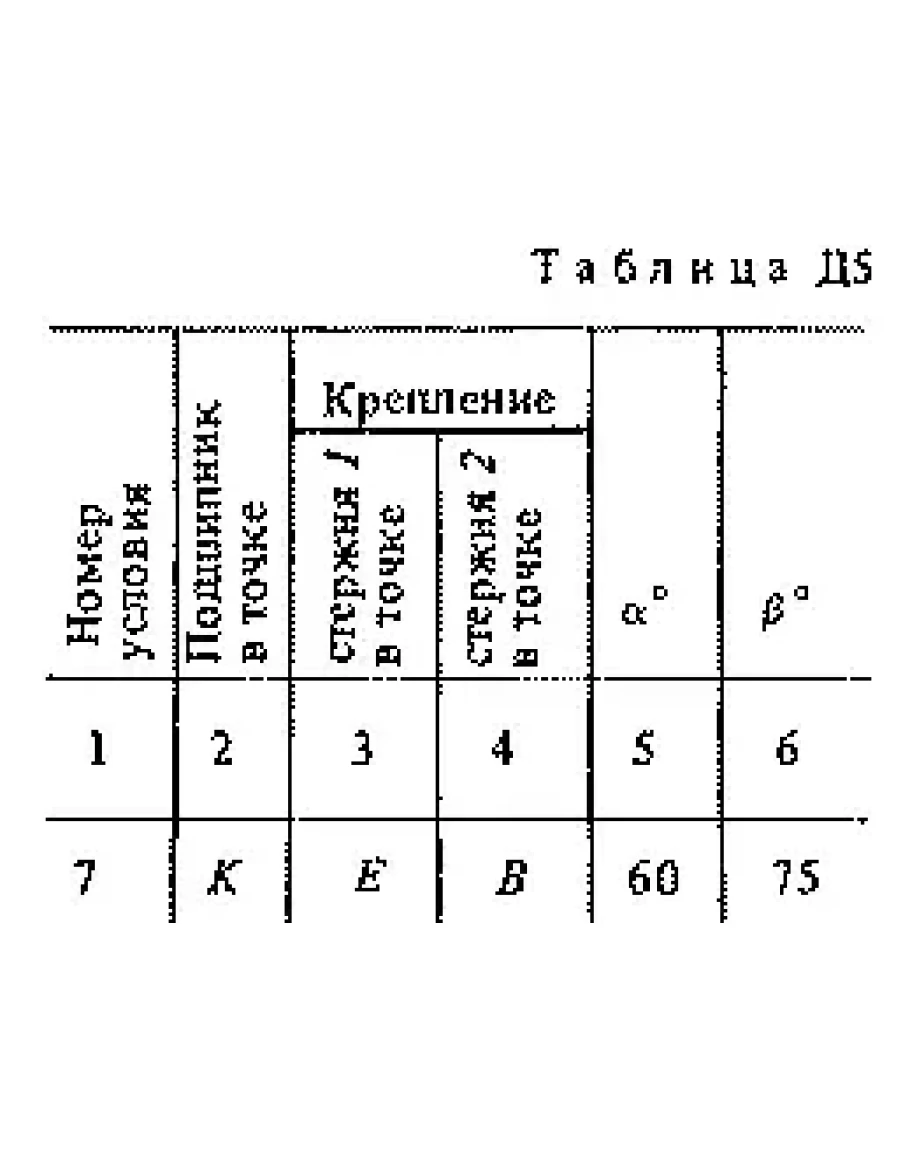 Вертикальный вал AK (рис. Д5.0-Д5.9, табл. Д5), вращающийся с постоянной угловой скоростью ω = 10 с-1, закреплен подпятником в точке А и цилиндрическим подшипником в точке, указанной в табл. Д5 в столбце 2 (AB = BD = DE = EK = b). К валу жестко прикреплены невесомый стержень 1 длиной l1 = 0,4 м с точечной массой m1 = 6 кг на конце и однородный стержень 2 длиной l2 = 0,6 м, имеющий массу m2 = 4 кг; оба стержня лежат в одной плоскости. Точки крепления стержней к валу указаны в таблице в столбцах 3 и 4, а углы α и β – в столбцах 5 и 6.